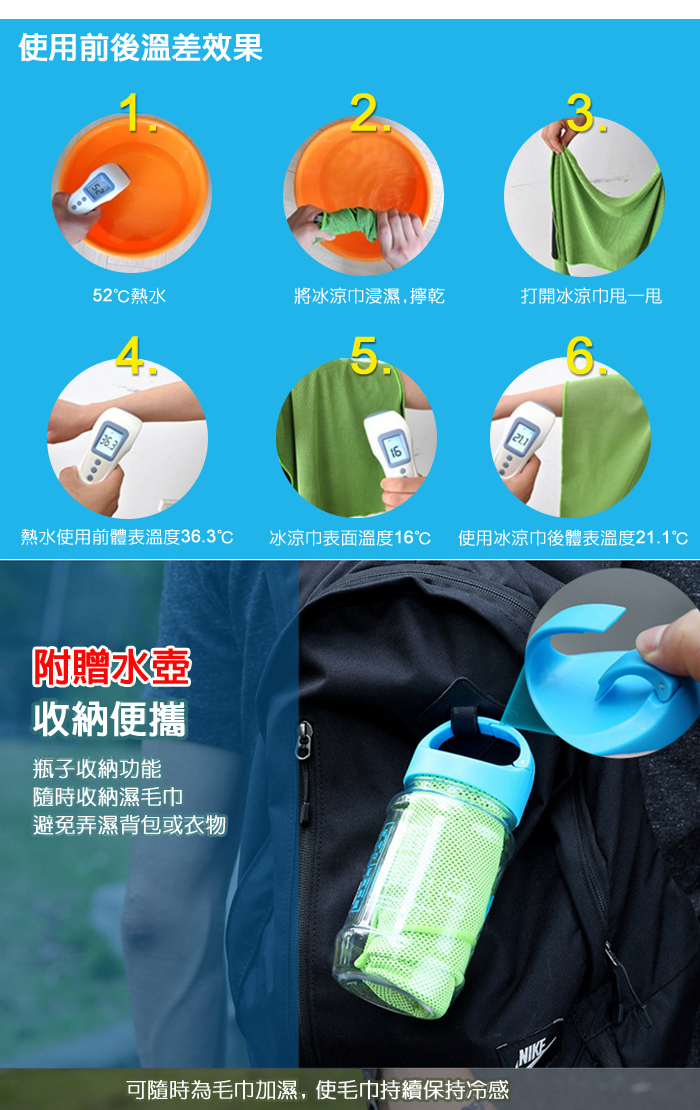 ◆浸溼於冷熱水甩動後皆能產生冷感效果