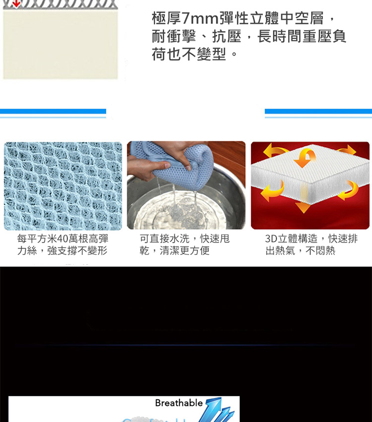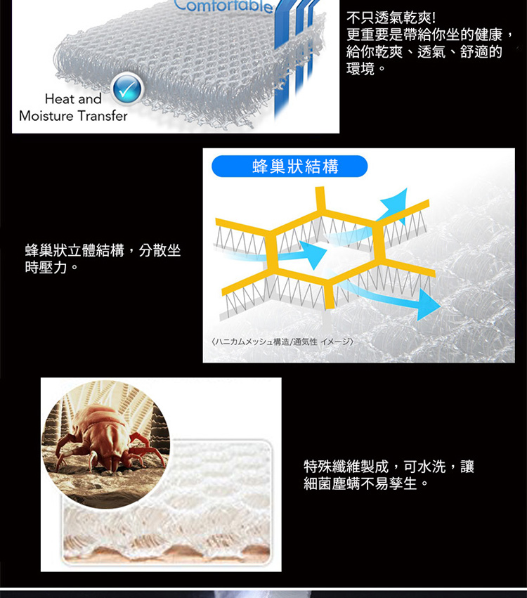 ●蜂巢狀網孔中空支撐結構,空氣可流通,擺脫悶熱感
