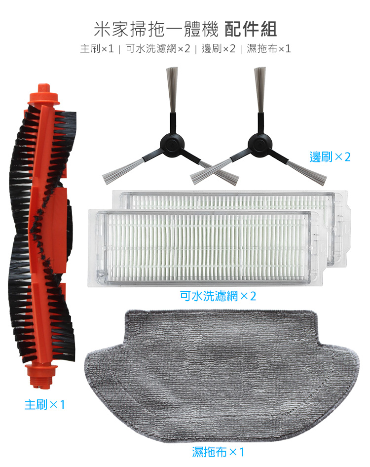 內容:可水洗濾網×2、濕拖布×1、主刷×1、邊刷×2