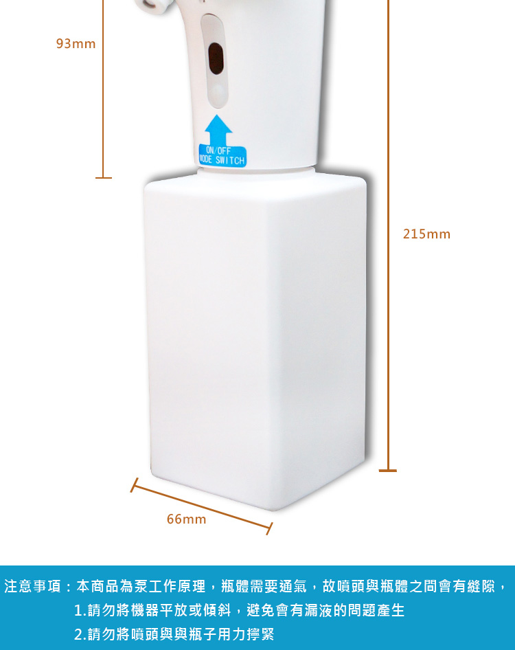 1.本商品為泵工作原理,瓶體需要通氣,故噴頭與瓶體之間會有縫隙,請勿將機器平放或傾斜,避免會有漏液的問題產生;請勿將噴頭與與瓶子用力擰緊。