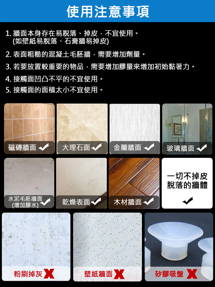 ※本產品適用於光滑平整的硬質表面(玻璃/磁磚/大理石/不鏽鋼面板/壓克力面板等;壁紙、絨布、或油漆易剝落/脫皮/掉粉的牆面"不適用",請注意。)
