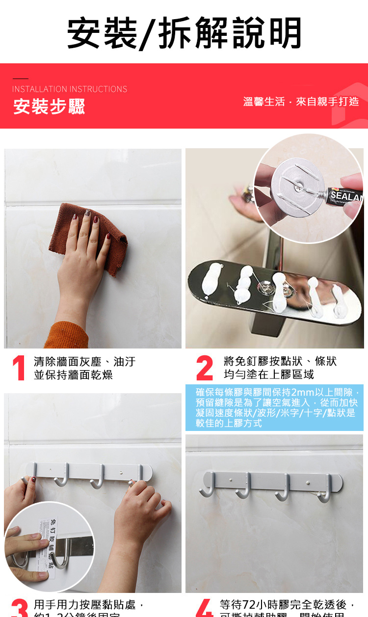 請依照正確安裝方法與上膠方式,並耐心等待72小時後再使用喔!