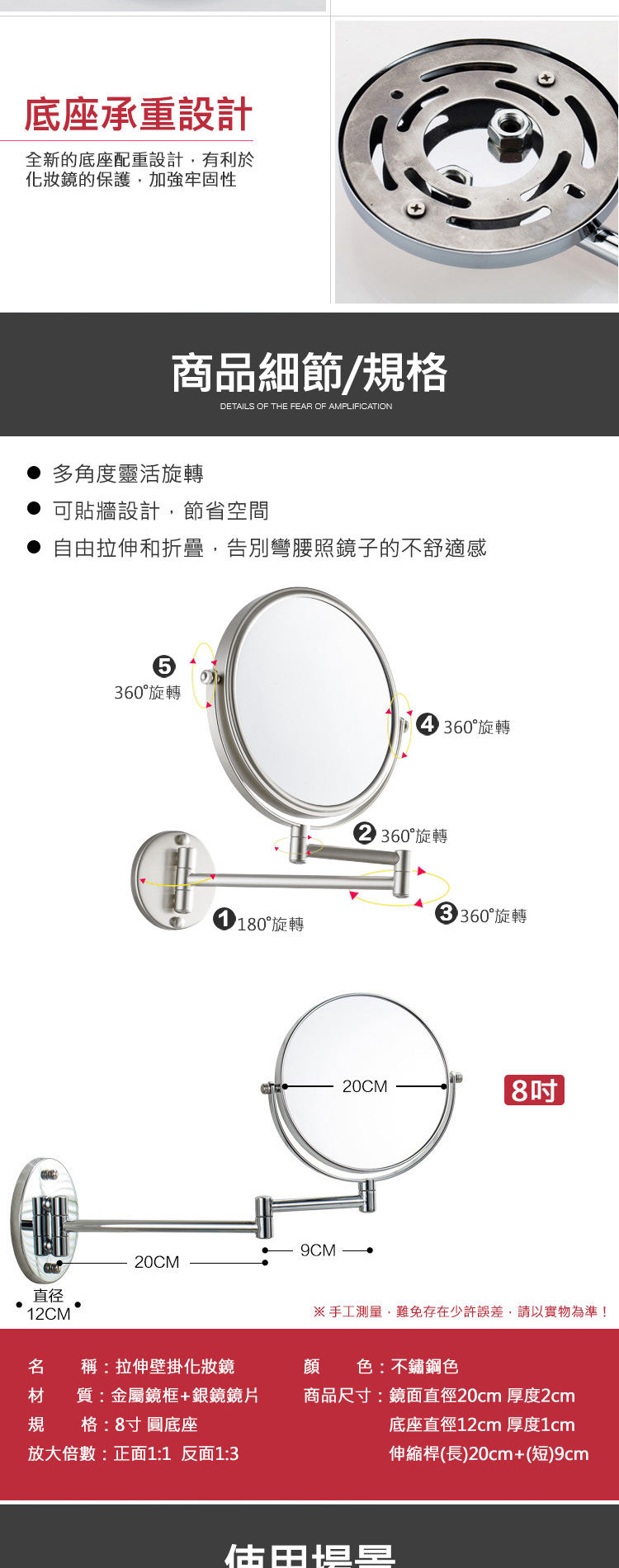 壁掛式折疊化妝鏡 伸縮梳妝鏡 浴室壁掛拉伸鏡子 伸縮/折疊/放大/雙面鏡 金屬雙面化妝鏡 衛生間/浴室美容鏡(8吋)