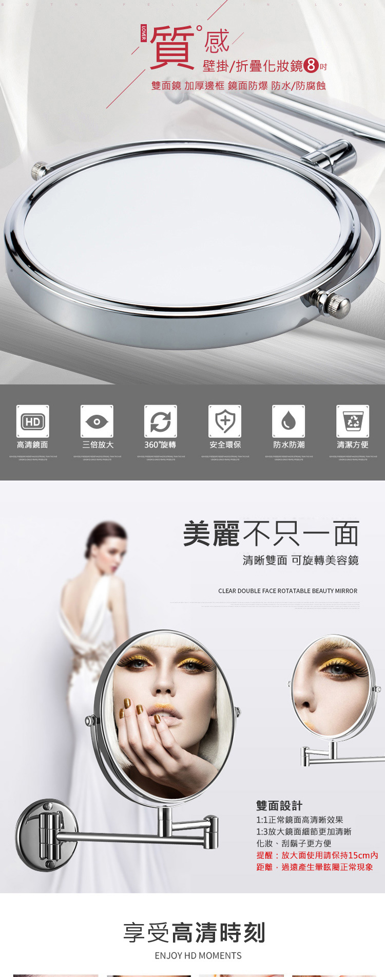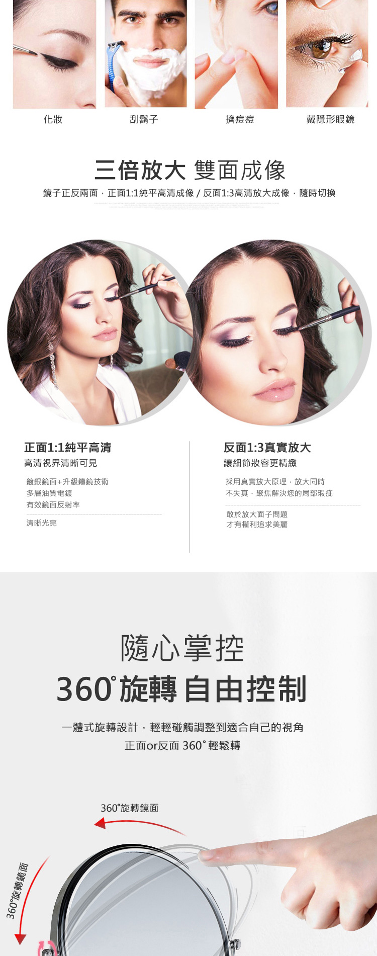 圓形雙面鏡 一面高清平鏡/一面真實放大3倍(提醒:放大面使用請保持15cm以內距離,距離過遠會暈眩屬正常現象!)