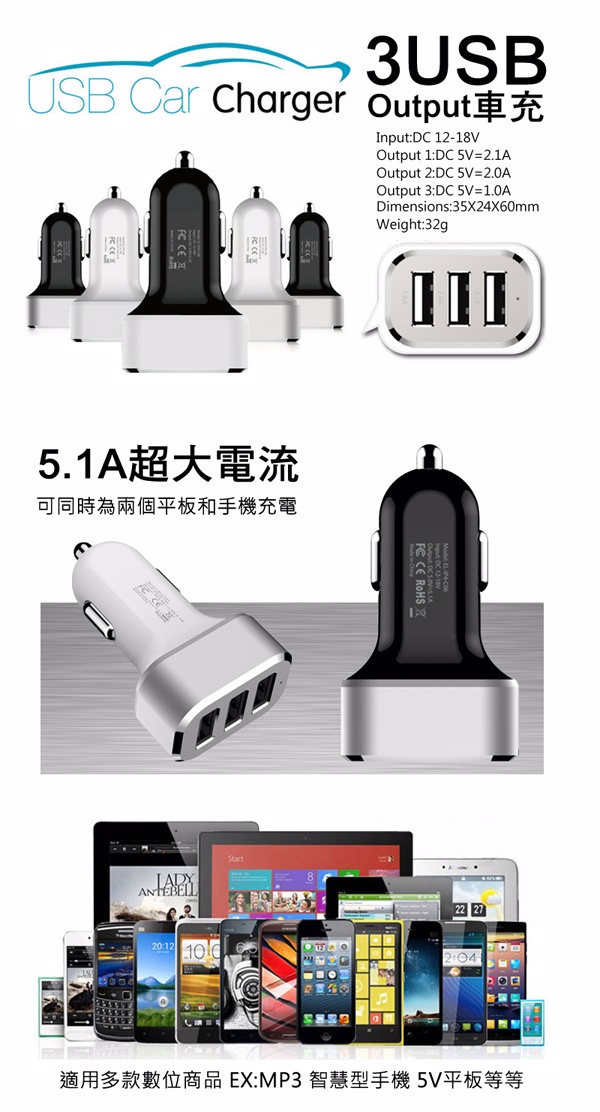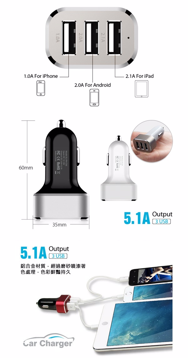 5.1A 3 USB車充 2.0A/2.1A/1A 車充 車上充電器 車用充電轉換器 可充智慧型手機 平板電腦