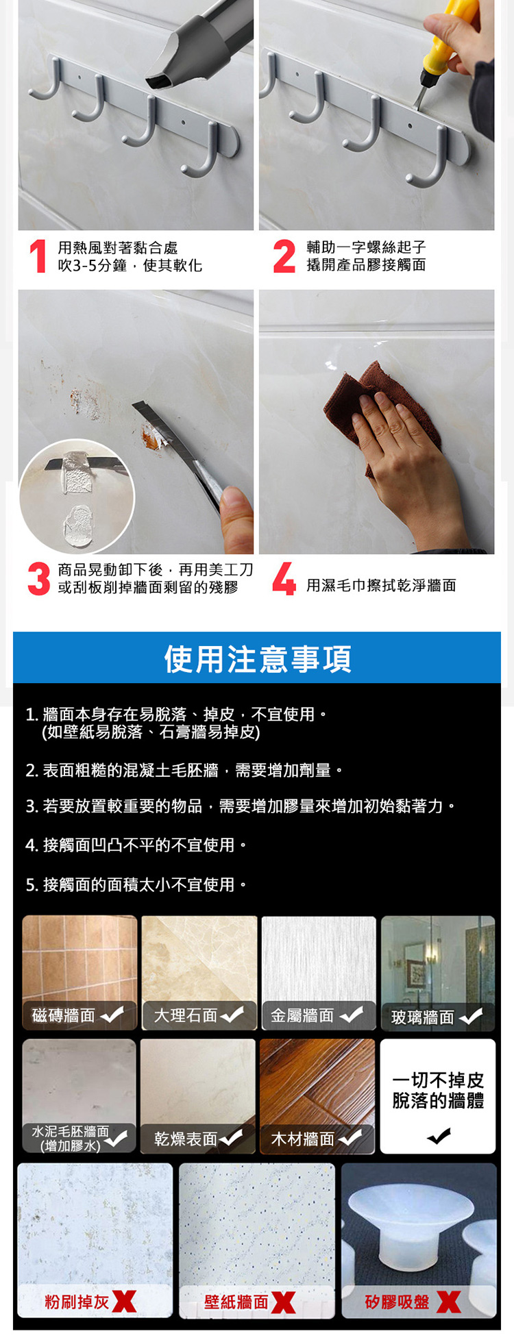 ※本產品適用於光滑平整的硬質表面(玻璃/磁磚/大理石/不鏽鋼面板/壓克力面板等;壁紙、絨布、或油漆易剝落/脫皮/掉粉的牆面"不適用",請注意。)