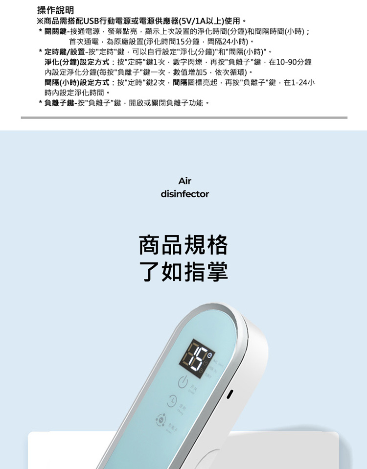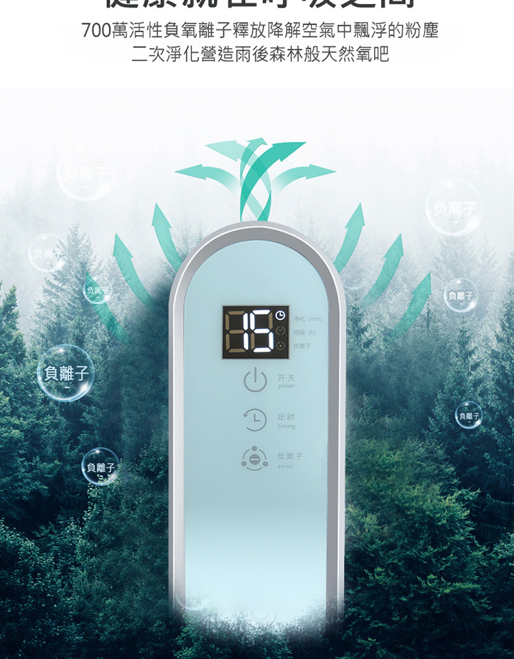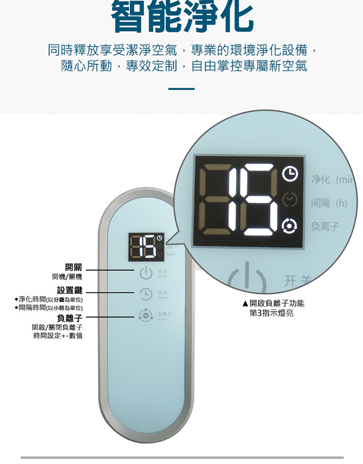 淨化(分鐘)設定方式:按"定時"鍵1次,數字閃爍,再按"負離子"鍵,在10-90分鐘內設定淨化分鐘(每按"負離子"鍵一次,數值增加5,依次循環)。