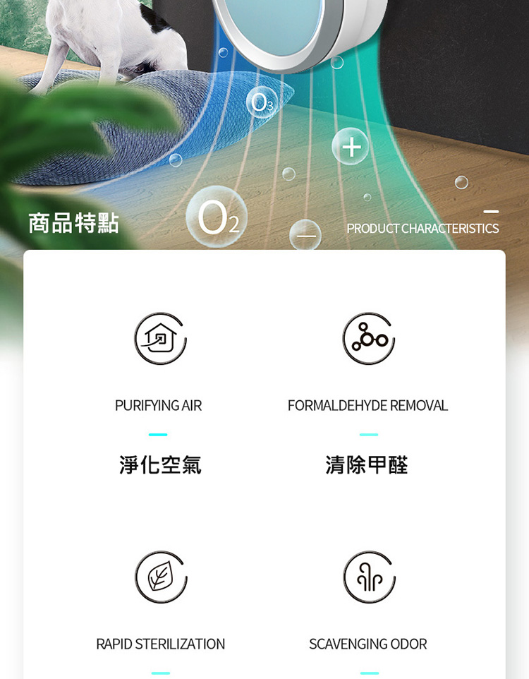 本機具有:除臭除味、分解甲醛、消毒殺菌的功能。