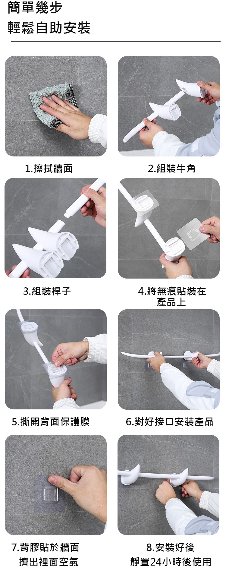 1.黏貼適用於光滑平整的硬質表面(玻璃/磁磚/大理石/不鏽鋼面板/壓克力面板等;壁紙、絨布、或油漆易剝落/脫皮/掉粉的牆面"不適用")。