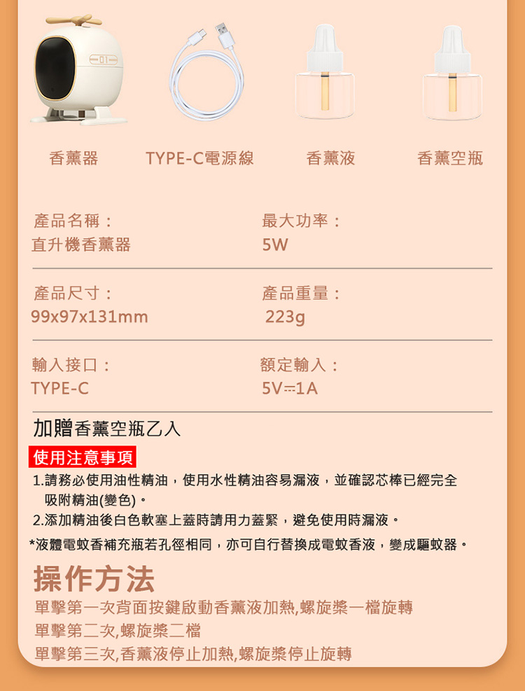 直升機香薰機 加熱式迷你擴香機/香氛機 無火精油 兩段風速 擴香/香氛/驅蚊 (USB供電)