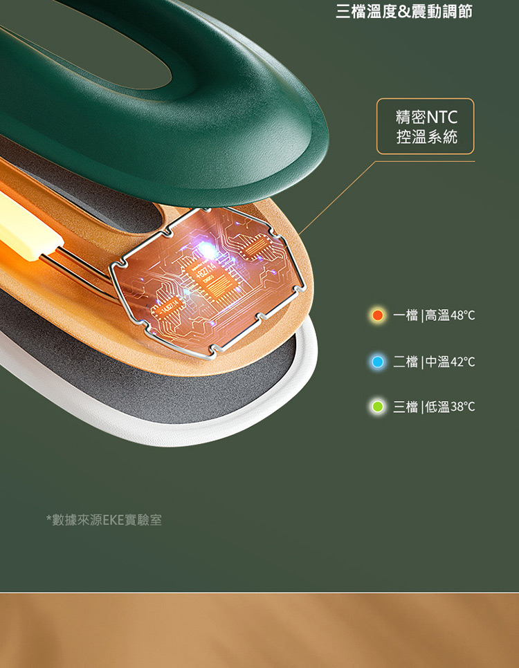 加熱按鍵:長按加熱鍵2秒開機,總共3個檔位,分別48°C、42°C、38°C,短按切換,工作15分鐘自動關機。