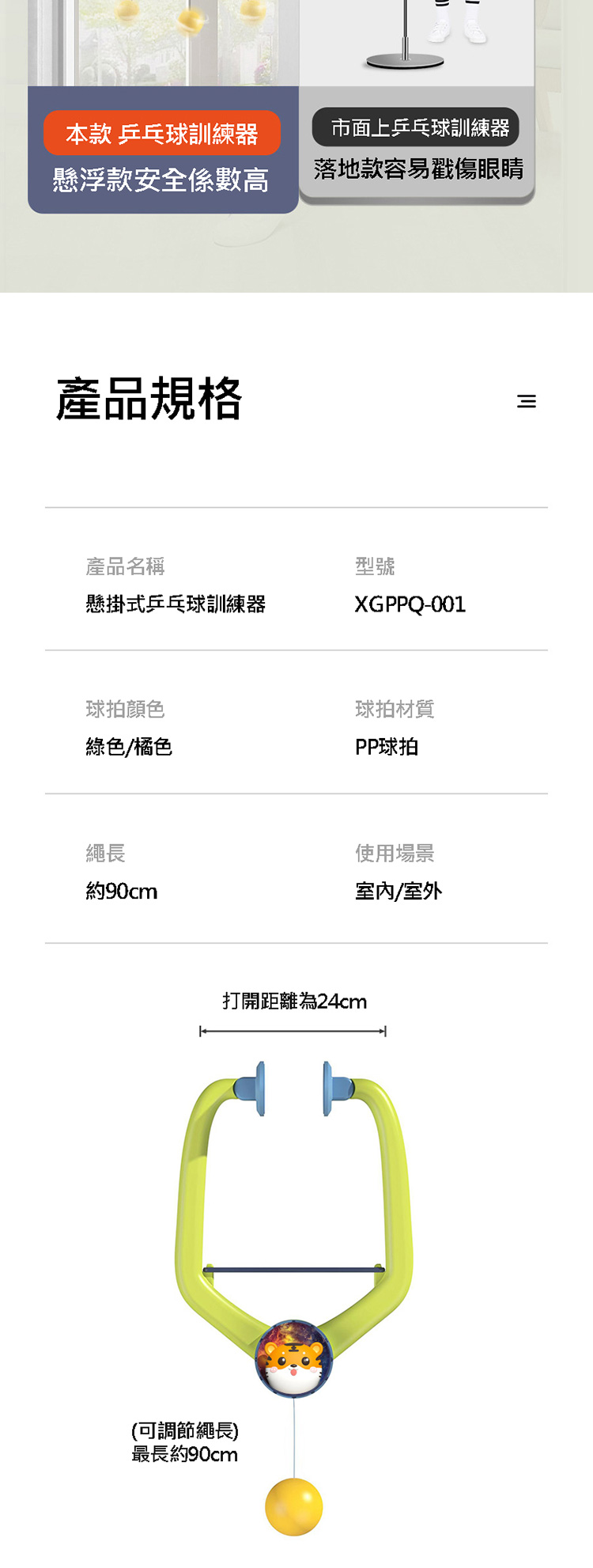 內容物:懸掛器x1 球拍x2 乒乓球x4 (1顆球已安裝於主體上)