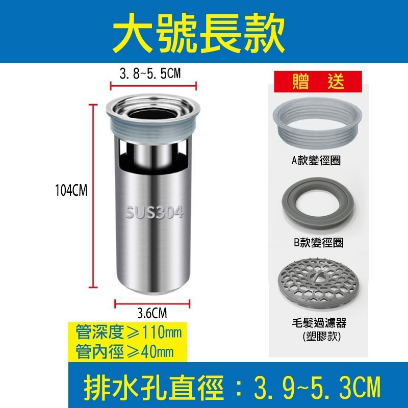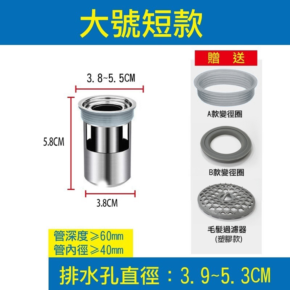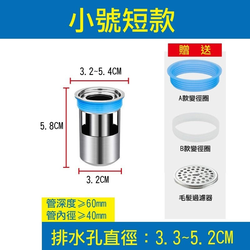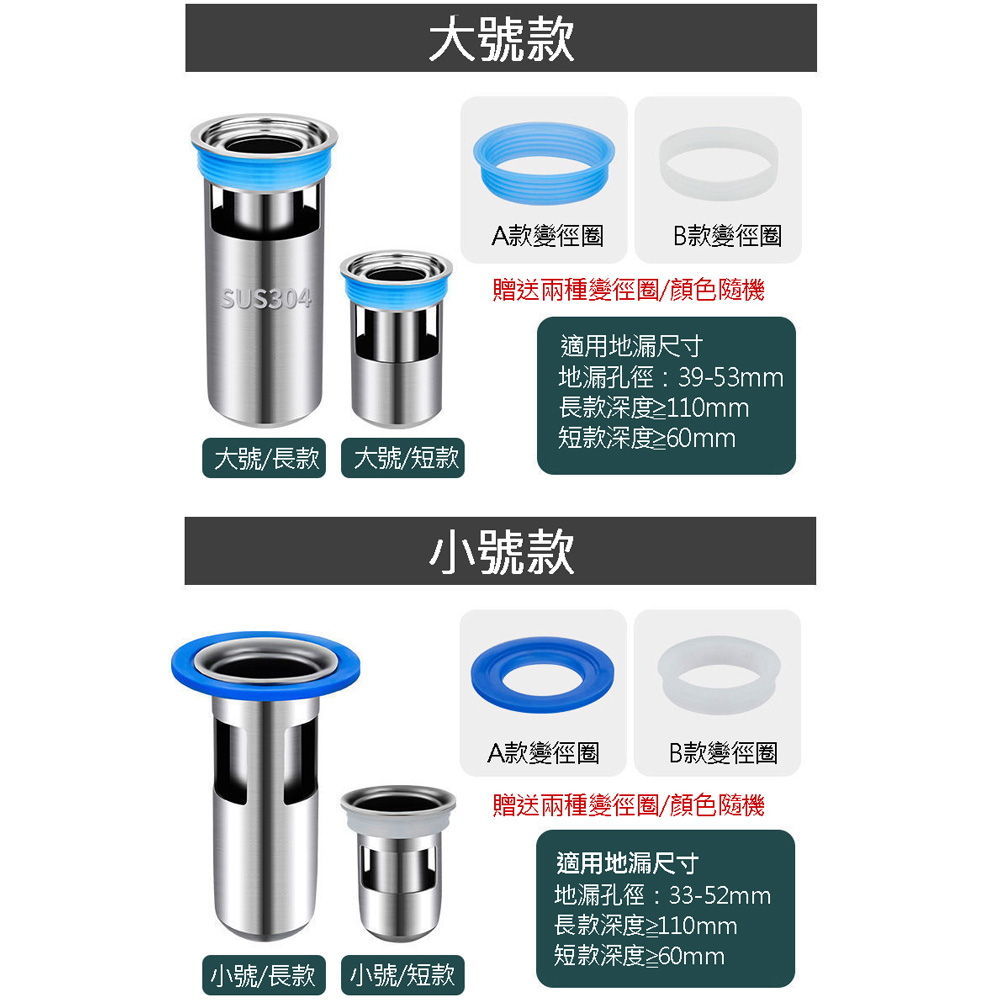 商品內容:地漏芯×1、A款(大)變徑圈×1、B款(小)變徑圈×1、毛髮過濾器×1