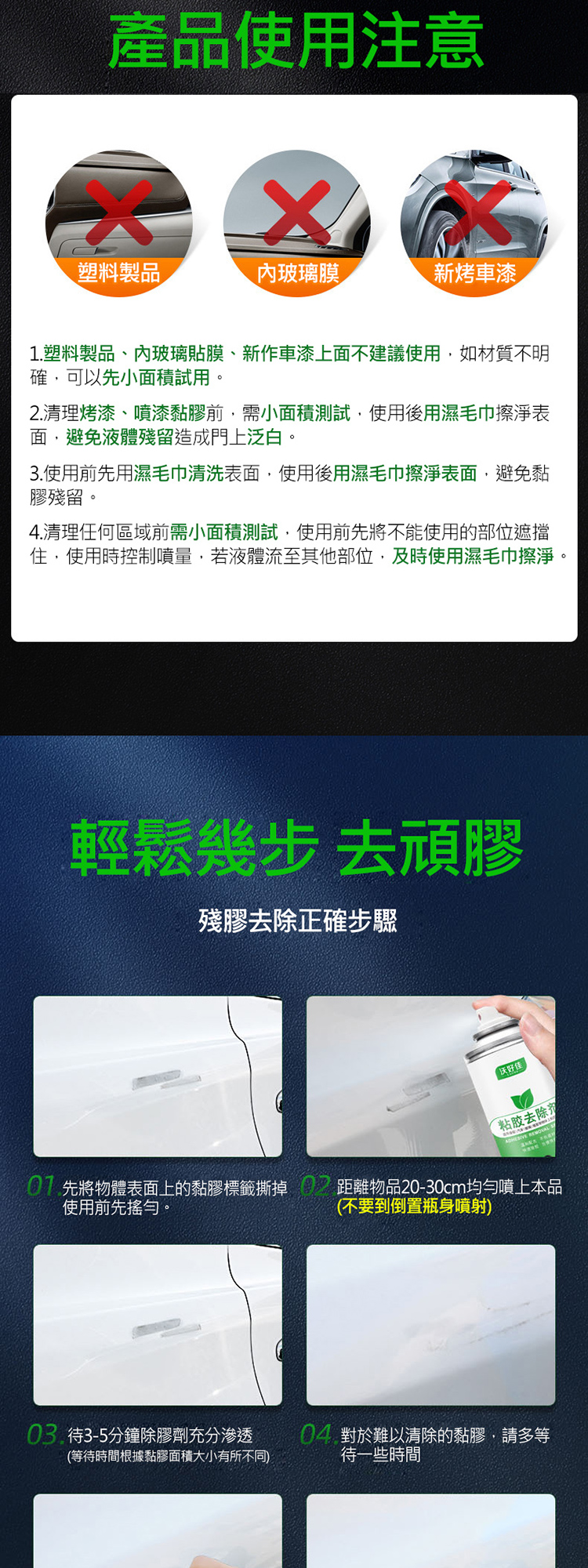 ●使用前先搖勻,將需清潔物體表面上的黏膠標籤撕掉,目的是使除膠劑能接觸到黏膠,距離物品表面約20-30公分處噴射黏膠處(不要到倒置瓶身噴射),待3-5分鐘除膠劑充分滲透後,用乾潔軟布擦拭乾淨。