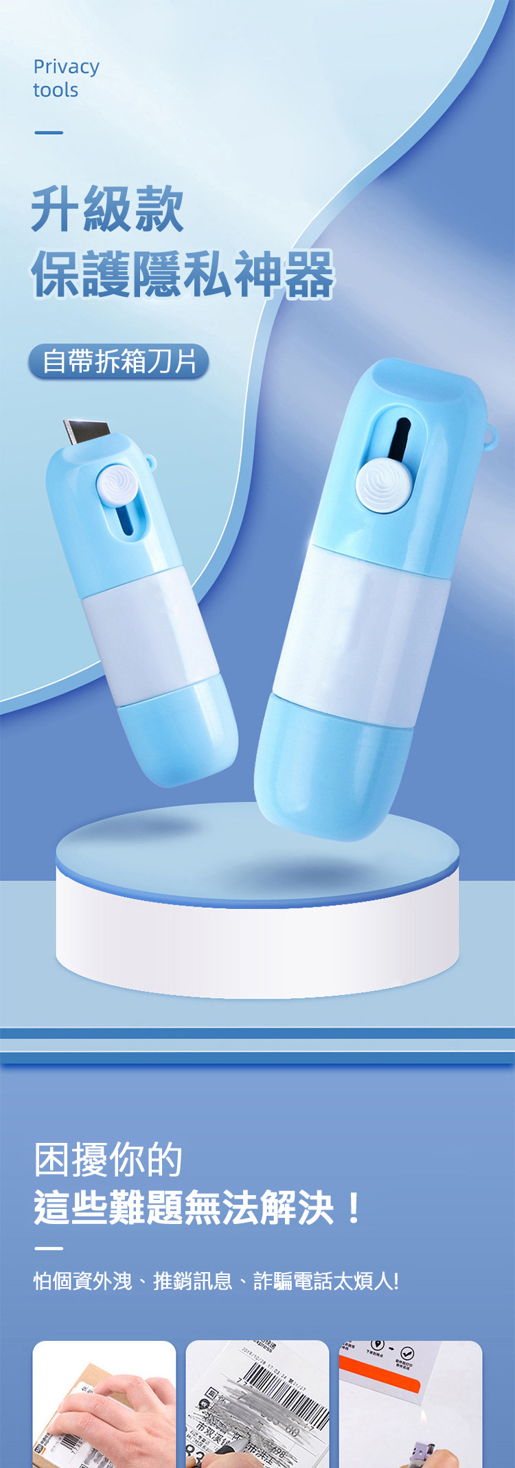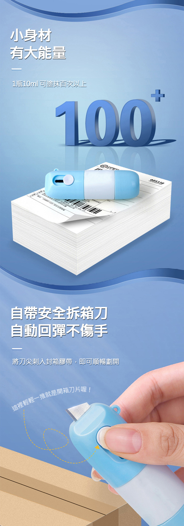 自帶刀片便利開箱,小刀片安全設計 不按即收回