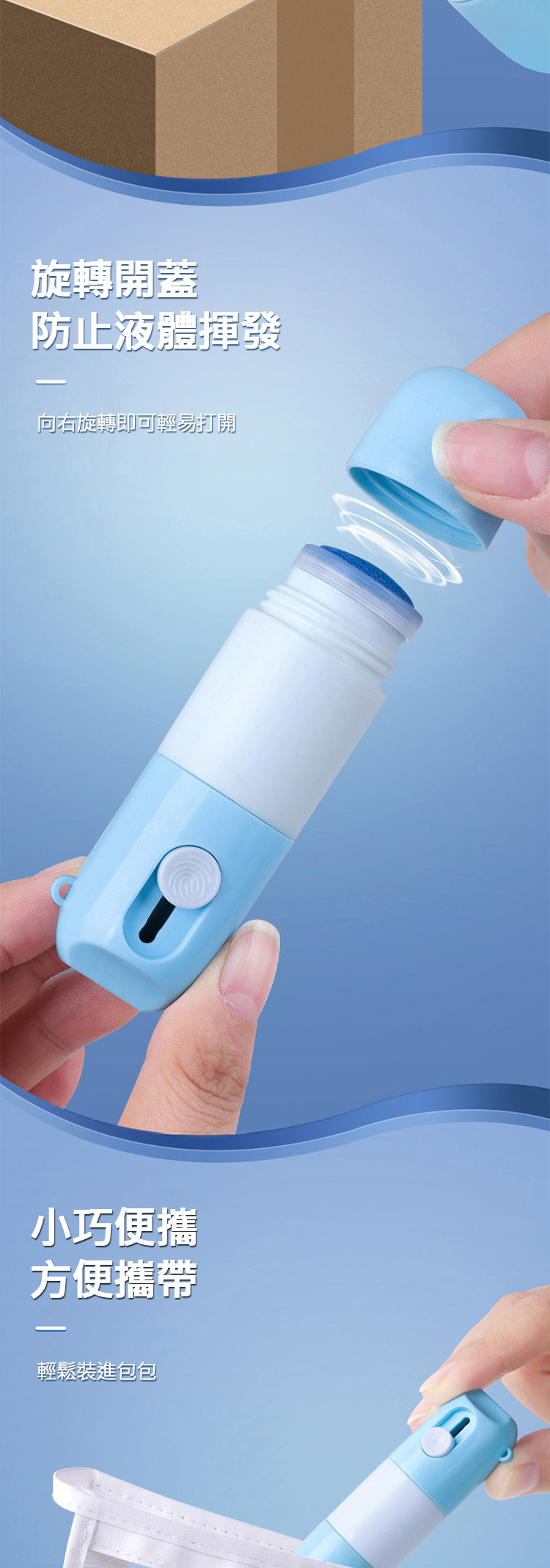 4.初次使用請輕輕按壓,讓瓶內液體跑出,使用後,應蓋緊上蓋防止液體揮發。