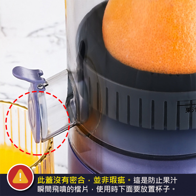 *出汁蓋沒有密合,並非瑕疵。這是防止果汁 瞬間飛噴的檔片,使用時下面要放置杯子。
