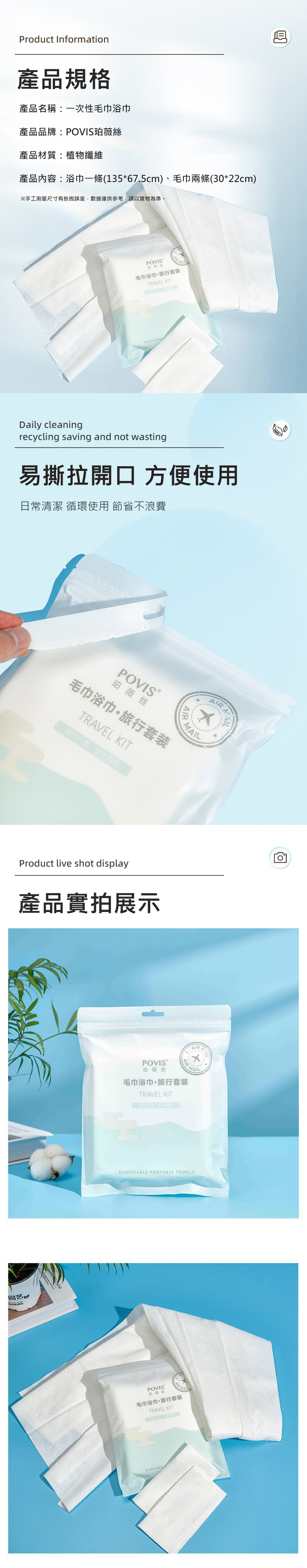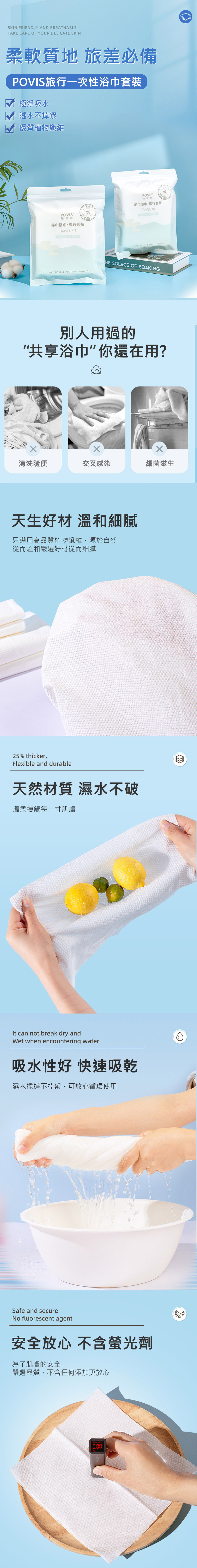 2.本產品不溶於水,用完後請將一次性毛巾/浴巾丟進垃圾桶,不要扔進馬桶裡,避免堵塞。