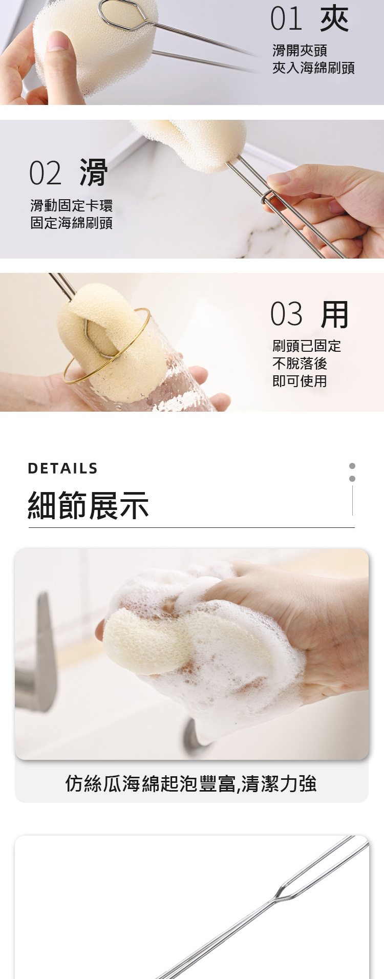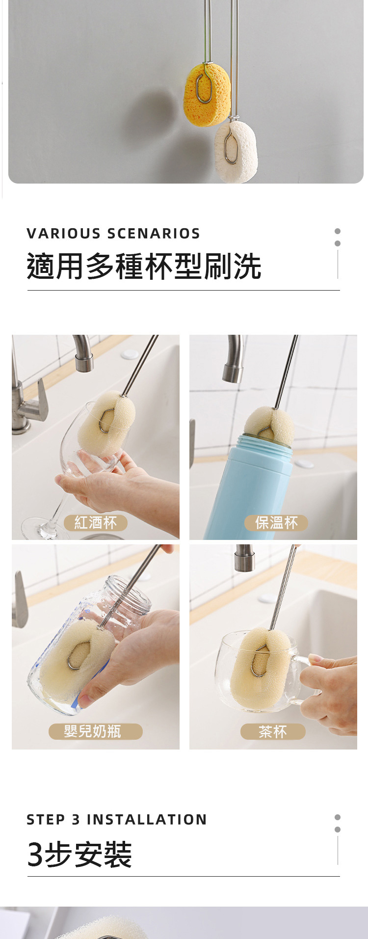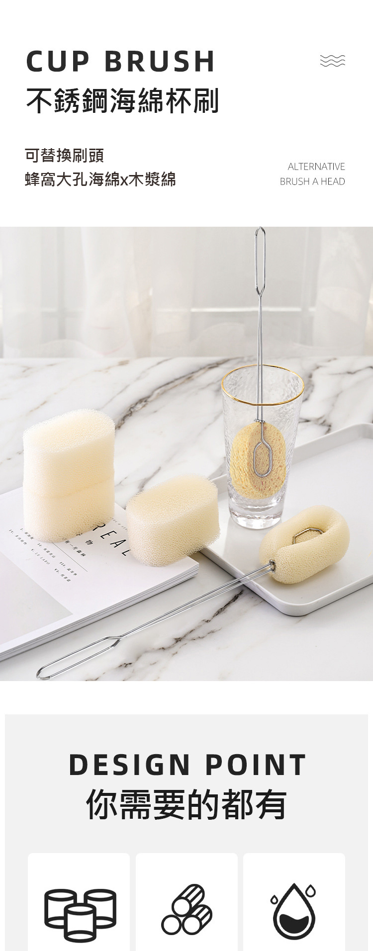 不銹鋼杯刷 可替換刷頭 長柄掛勾 海綿刷 奶瓶刷 保溫瓶刷 套件組(1柄+4刷頭)