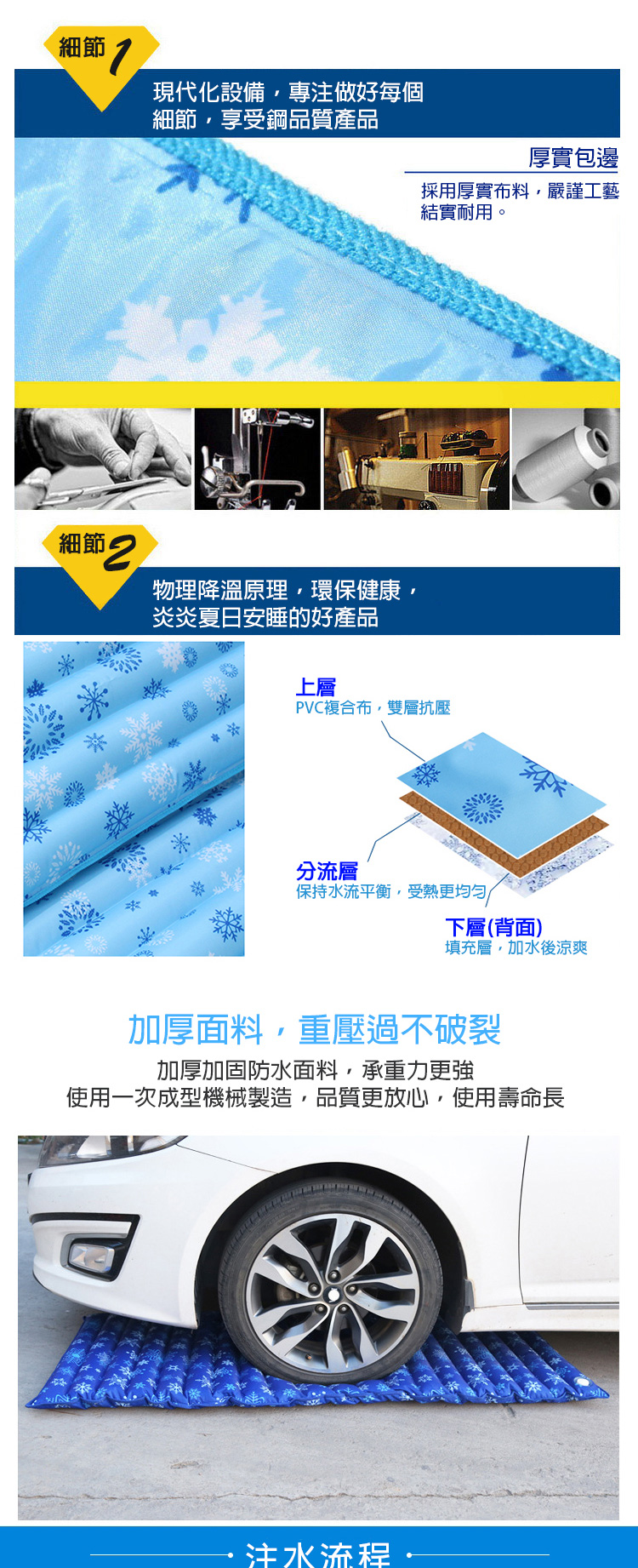出貨時產品本身為未注水狀態,需自行添加水,冰墊都採大注水口,加水方便,直接對準水龍頭加水即可,加一次水可反覆使用無需更換,加水量為充飽的一半~7分滿高度即可。