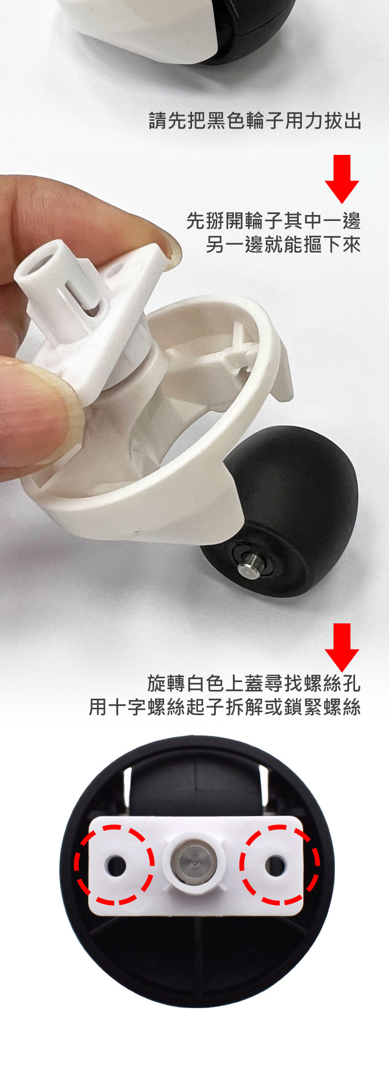 1.請先把黑色輪子用力拔出(先掰開輪子其中一邊,另一邊就能摳下來)