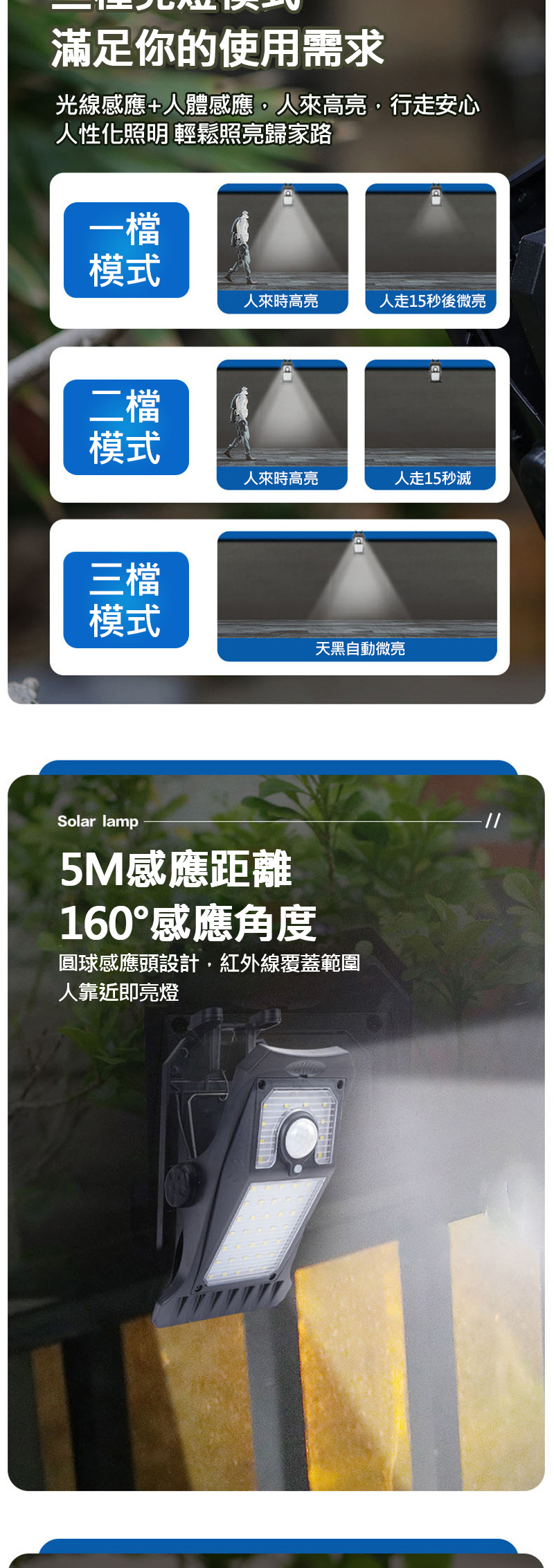 1.開關鍵按第一下:人來高亮約15秒,人走持續微亮