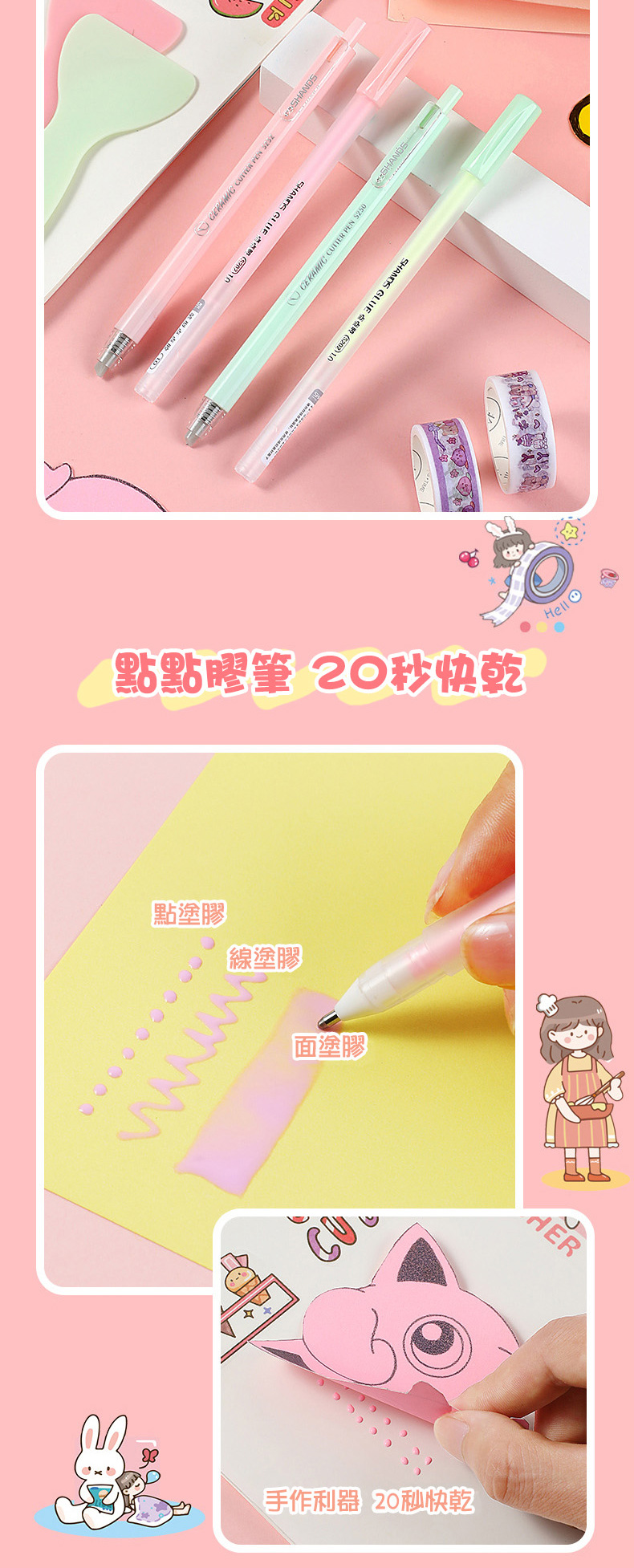 ✦筆型設計好塗抹、出膠均勻,有六種顏色膠水筆可使用(初次使用請多畫幾次等出膠再用)