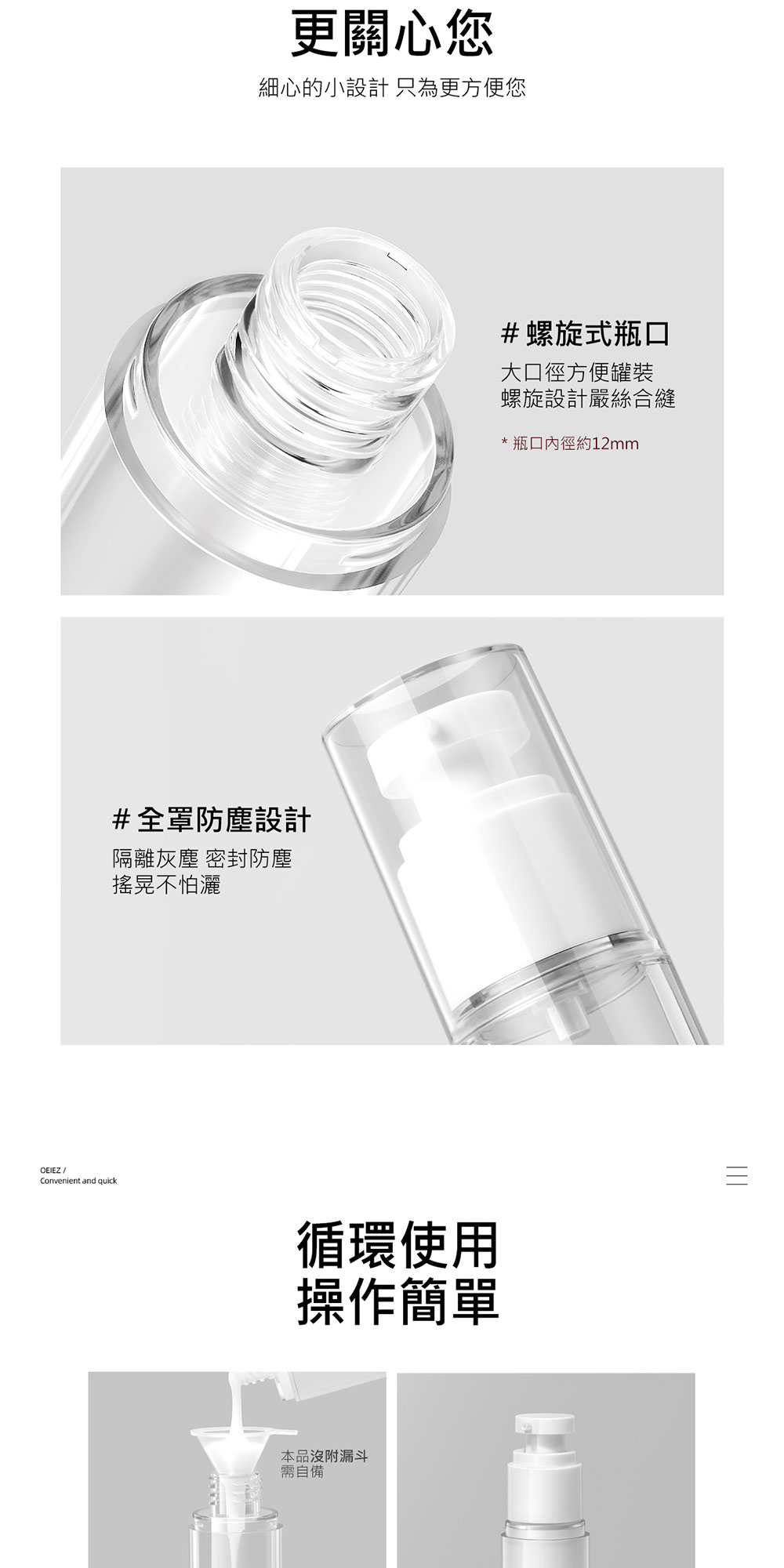 ◆乳液出液粒粒細膩,適用於各種乳液、水狀液體的分裝