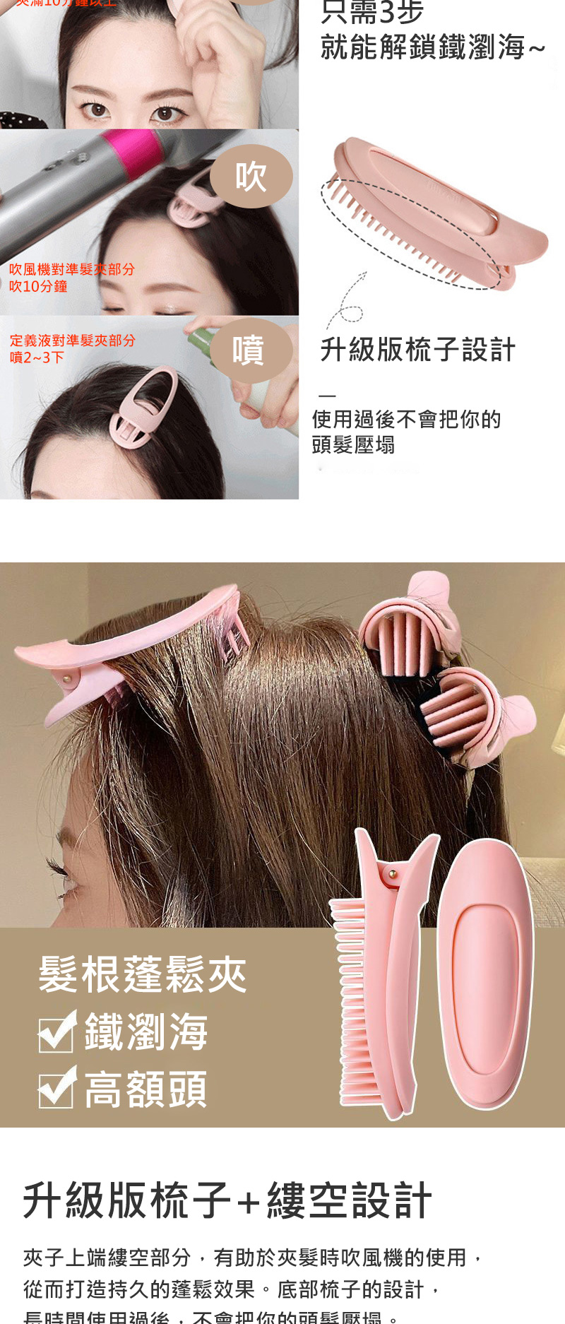 升級版梳子+鏤空設計夾子上端鏤空部分有助於吹風機的使用長時間使用過後不會把您的頭髮壓塌