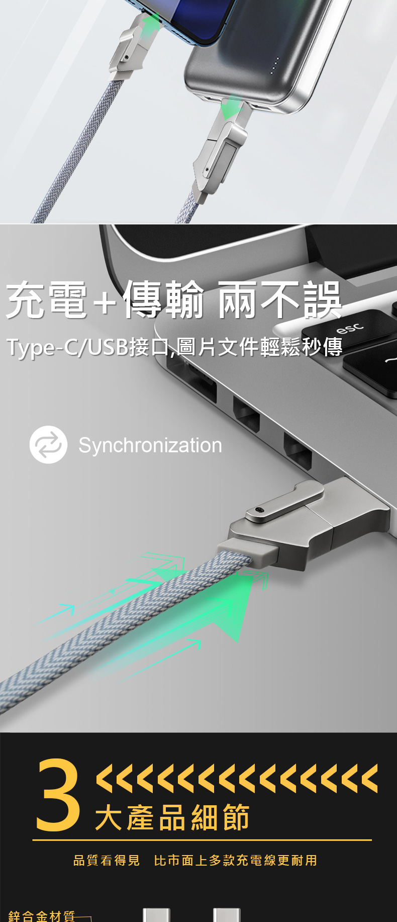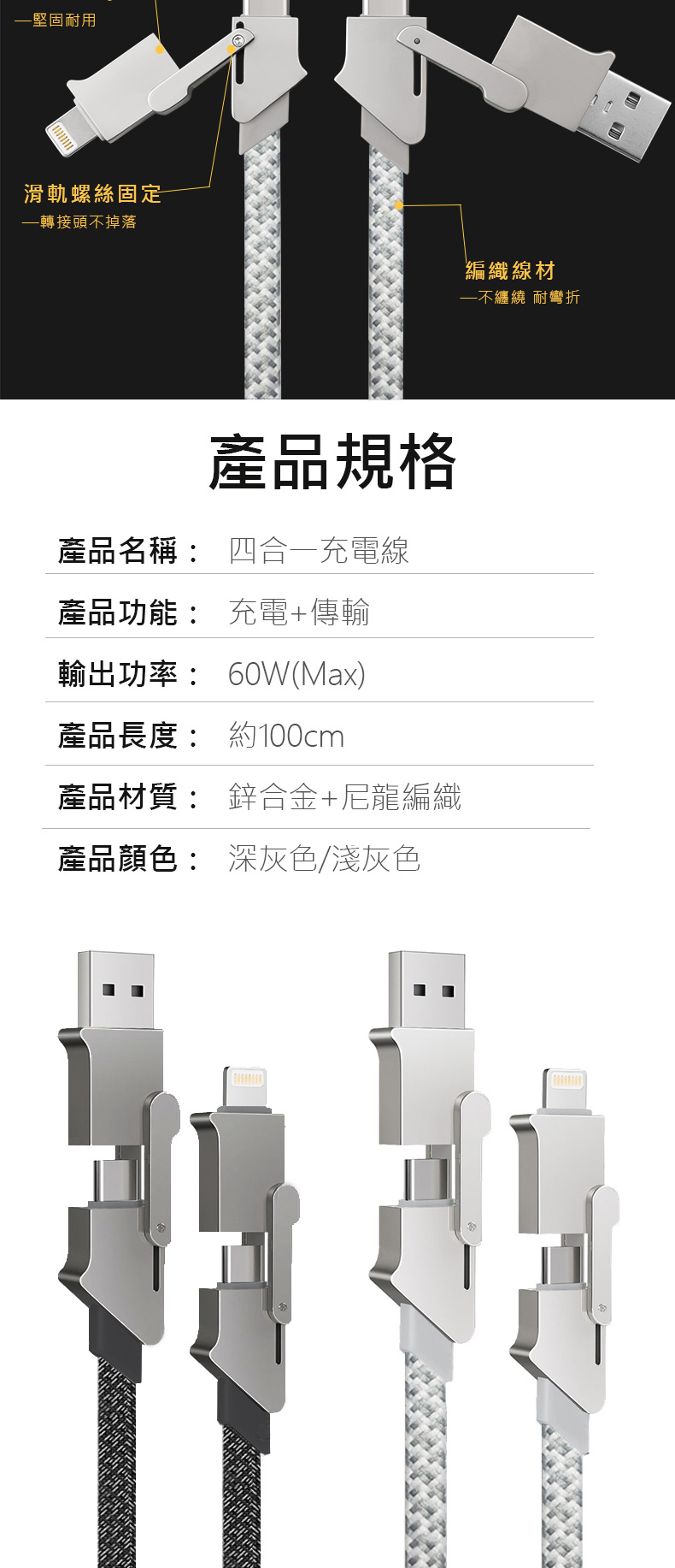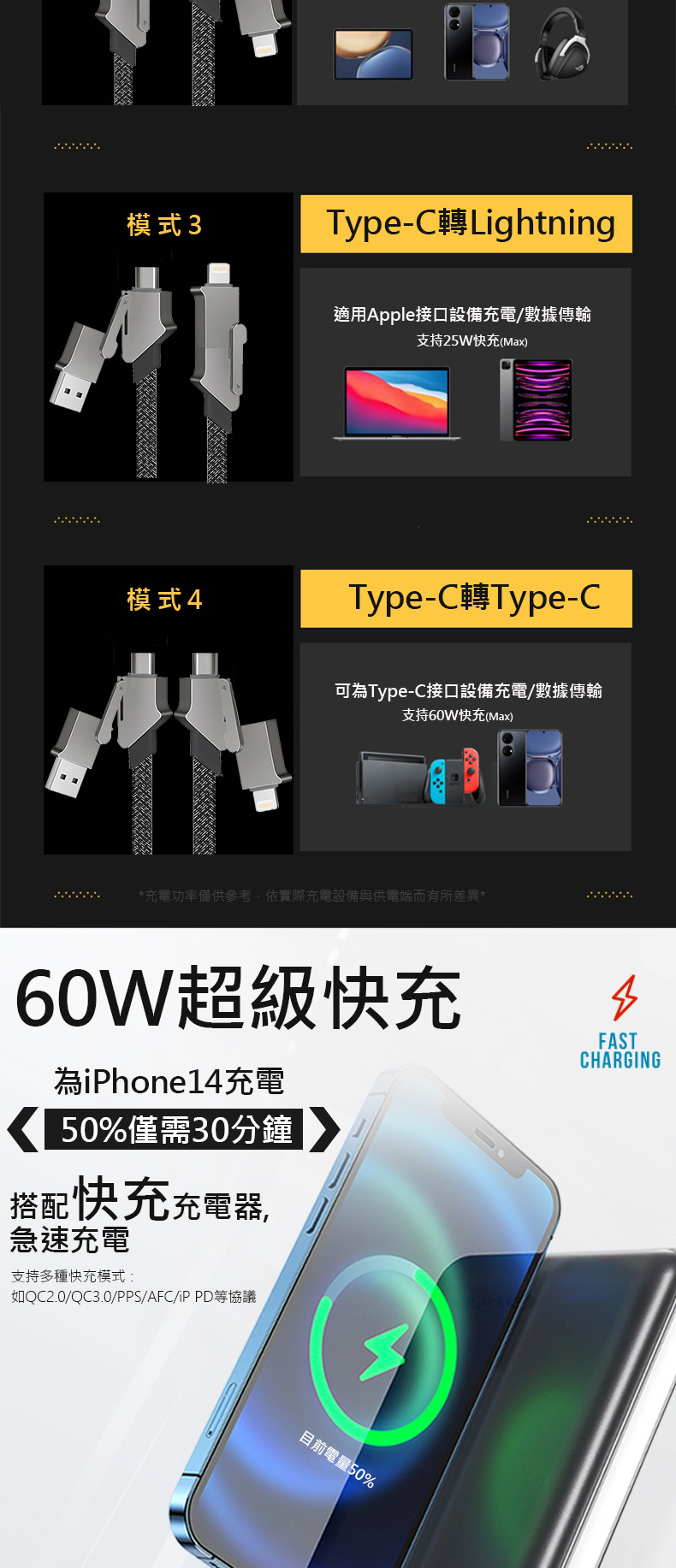 四合一PD充電線 4合1 超快速充電 鋅合金 數據線 Type-C/Lightning 一線四頭 (支援60W)