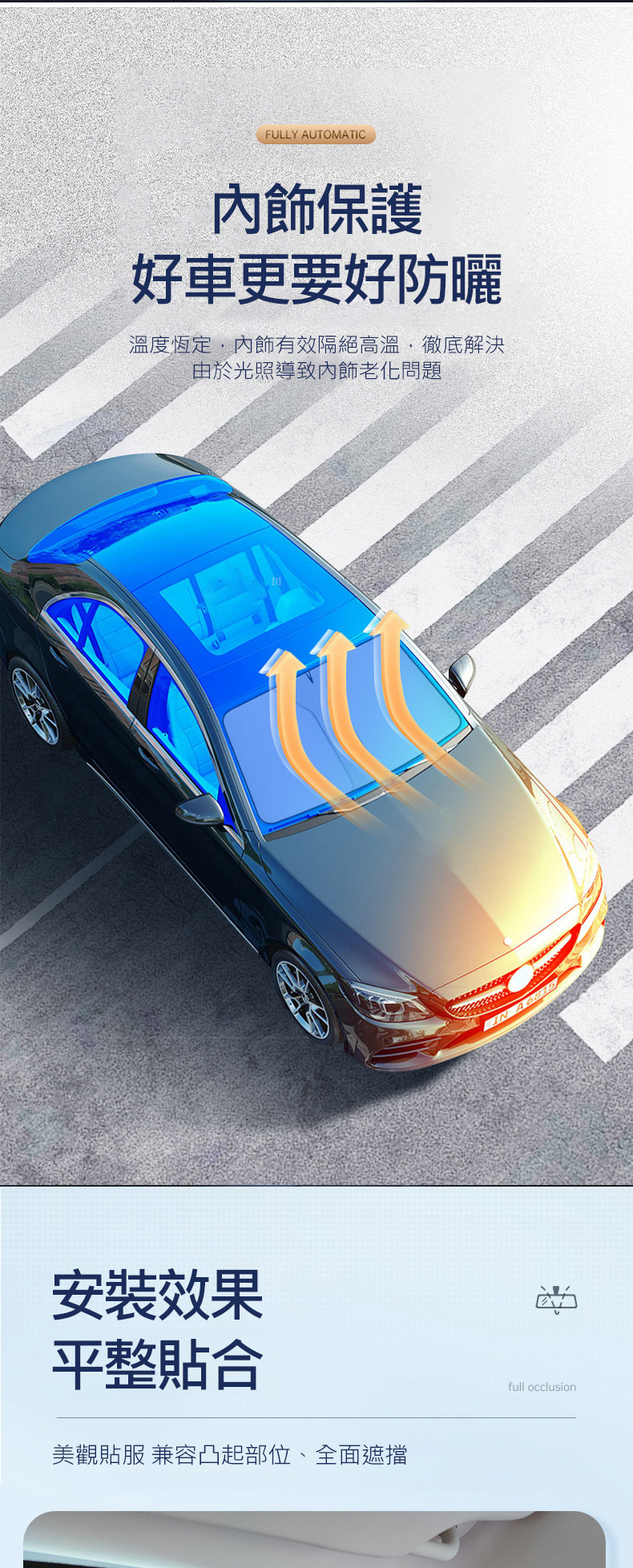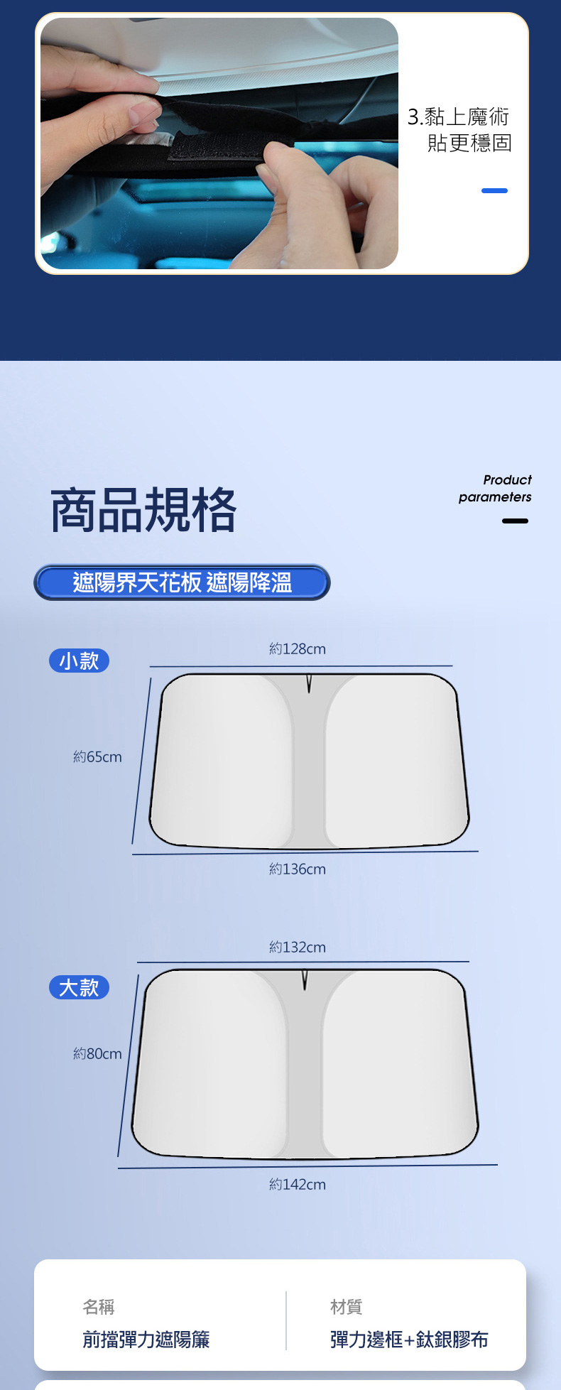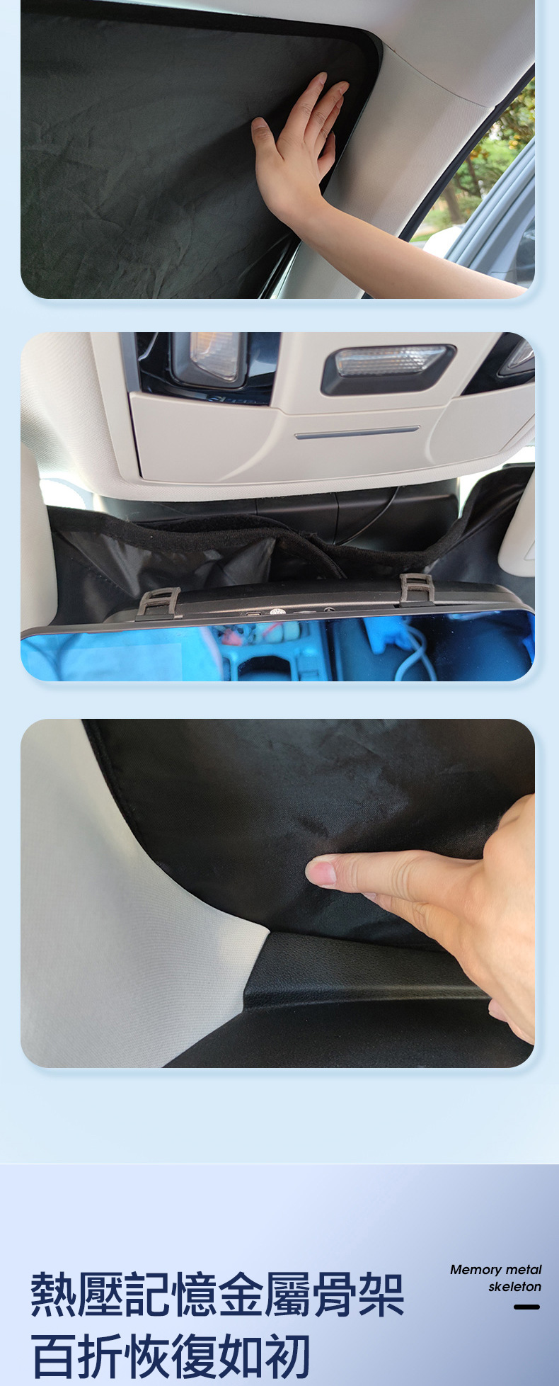 利用遮陽擋材質的獨有伸縮韌性,直接平舖前面玻璃即可 完美貼合 安裝超級簡單。