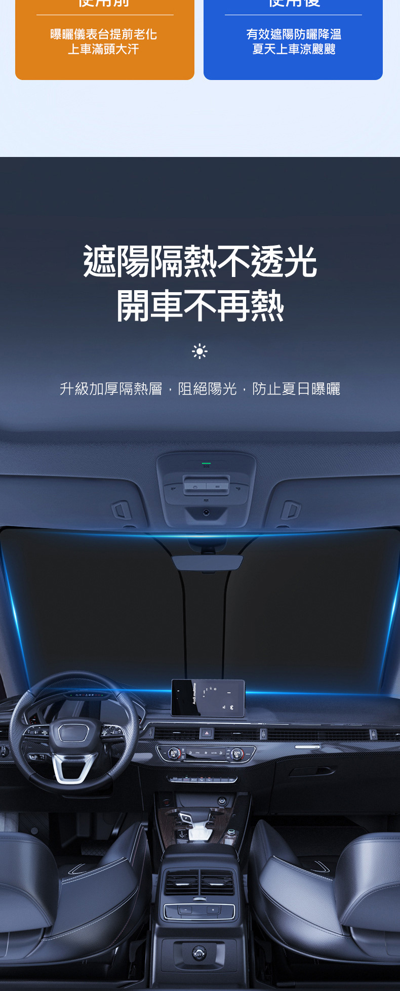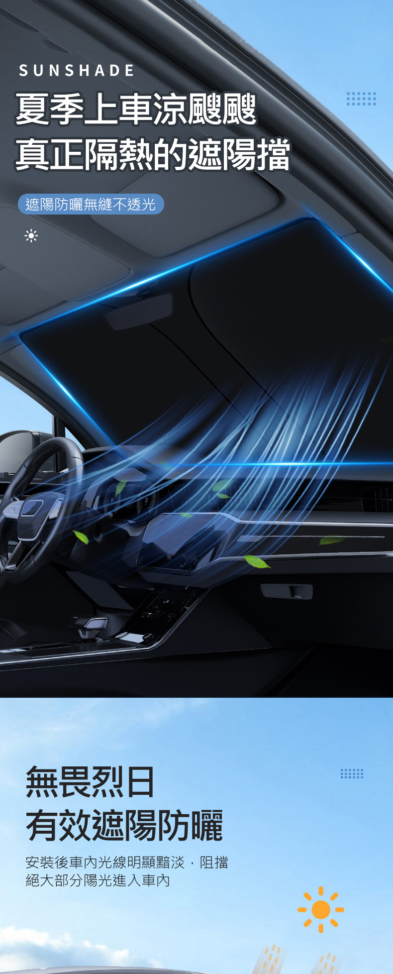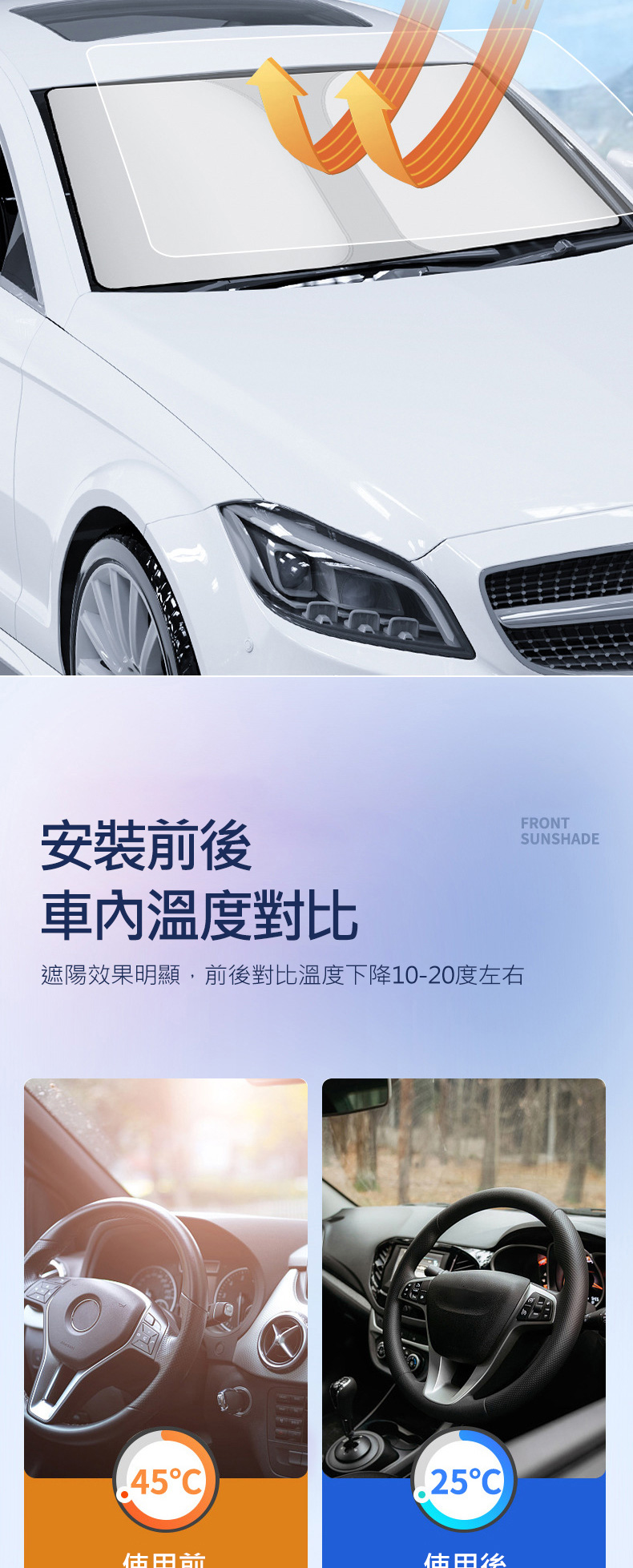 6. 外銀內黑-外銀色可以更好的反射熱量;內黑色更好的降低陽光穿透效果,有效降低曝曬後車內高溫,保持車內溫度涼爽舒適