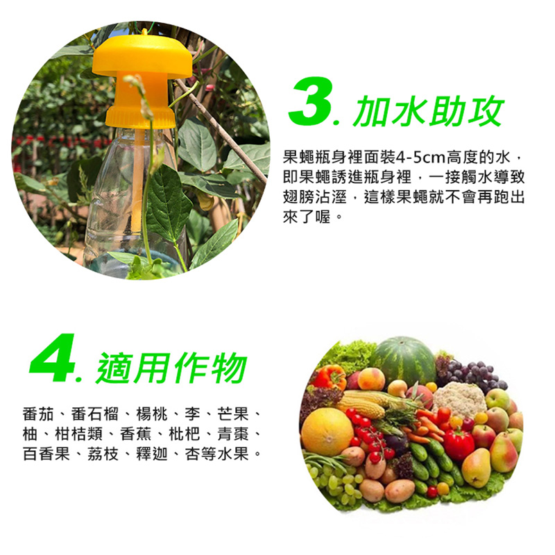 3.可以在瓶子內裝4-5cm高度的水,誘捕器內的果蠅(害蟲)不再跑出來。