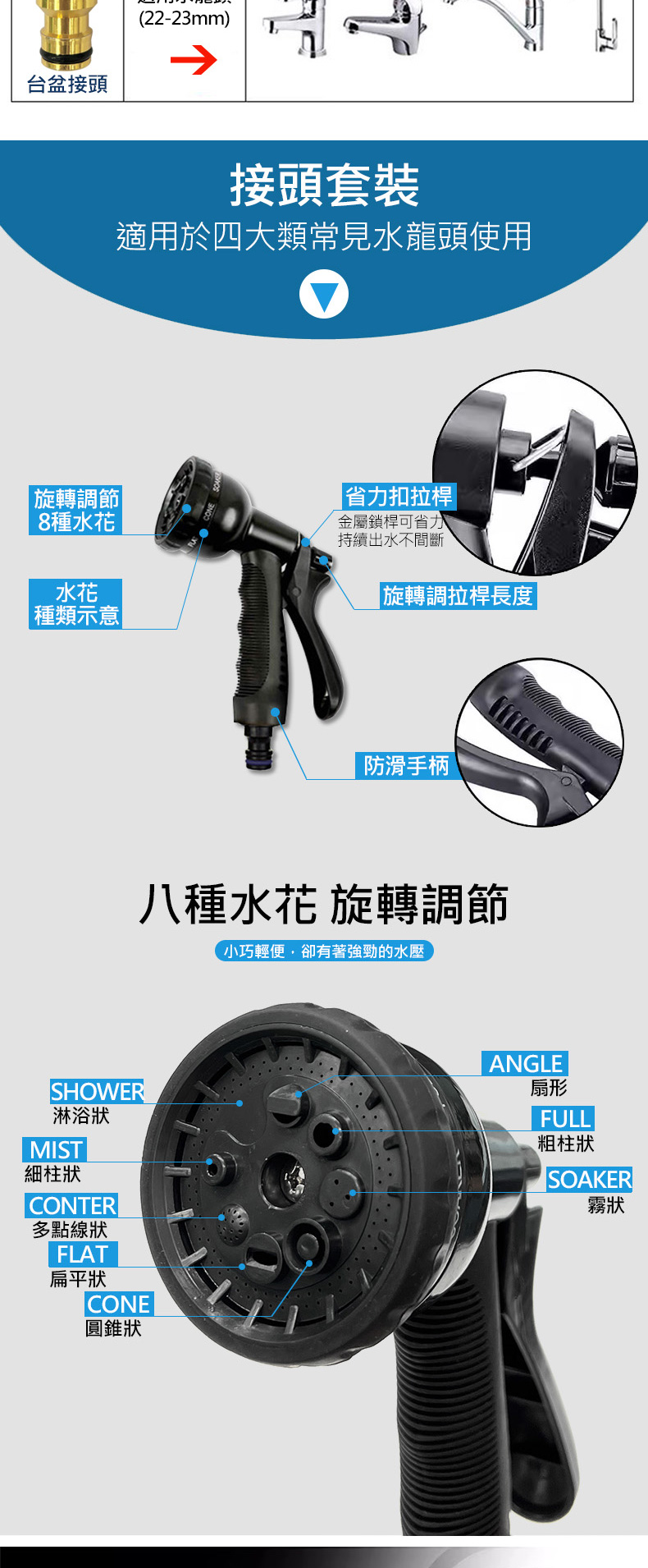 無異味 不脆化 園藝 洗車 澆花 洗窗 洗車噴頭工具套裝 噴槍 8段水花模式 (附8段式水槍 氣密式轉接頭)