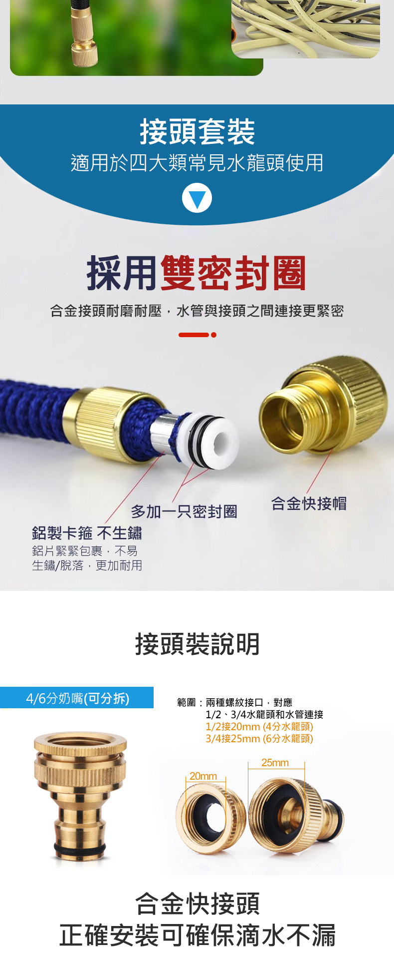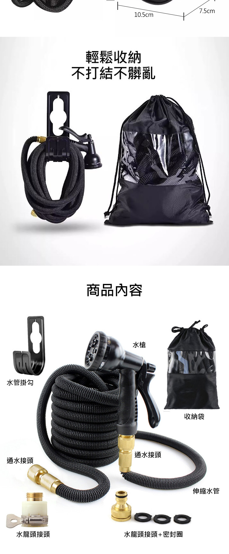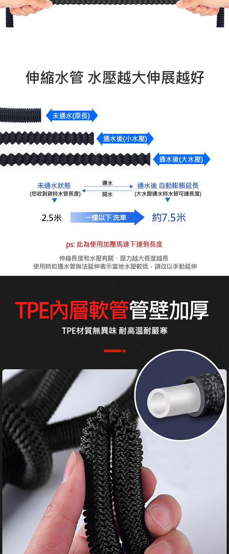 ◆水管尺寸:收納2.5M ±5%-注水後變成7.5M ±5% (因當地水壓大小而影響延伸長度)