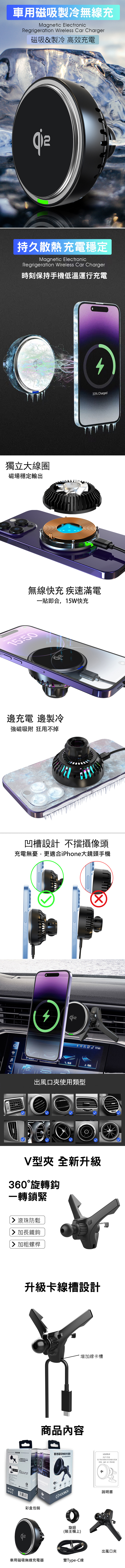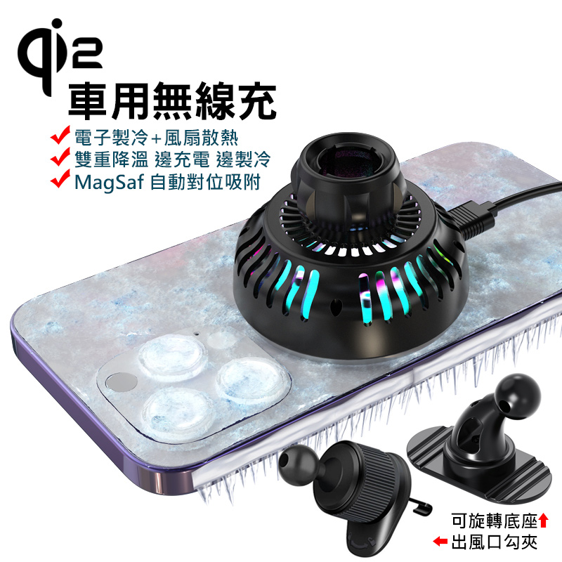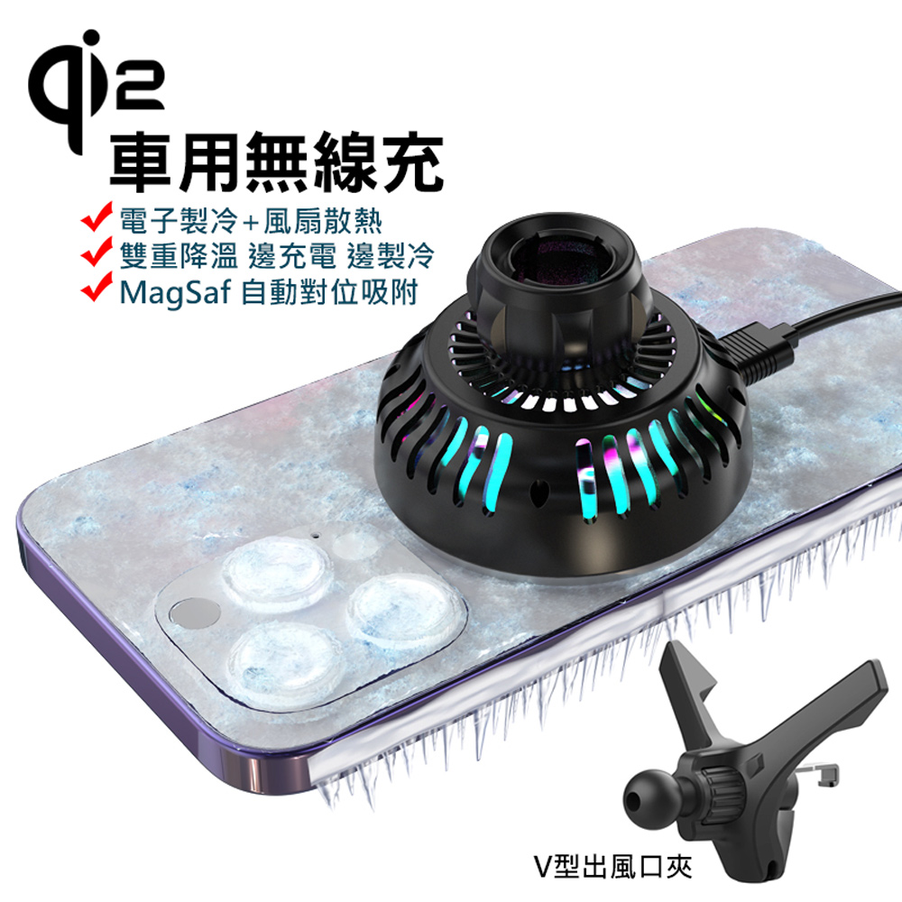電子製冷磁吸車用無線充電器 支持QI2無線充電 快充 15W快充車用無線磁吸充電器 MagSafe 汽車手機架 製冷 散熱 出風口支架