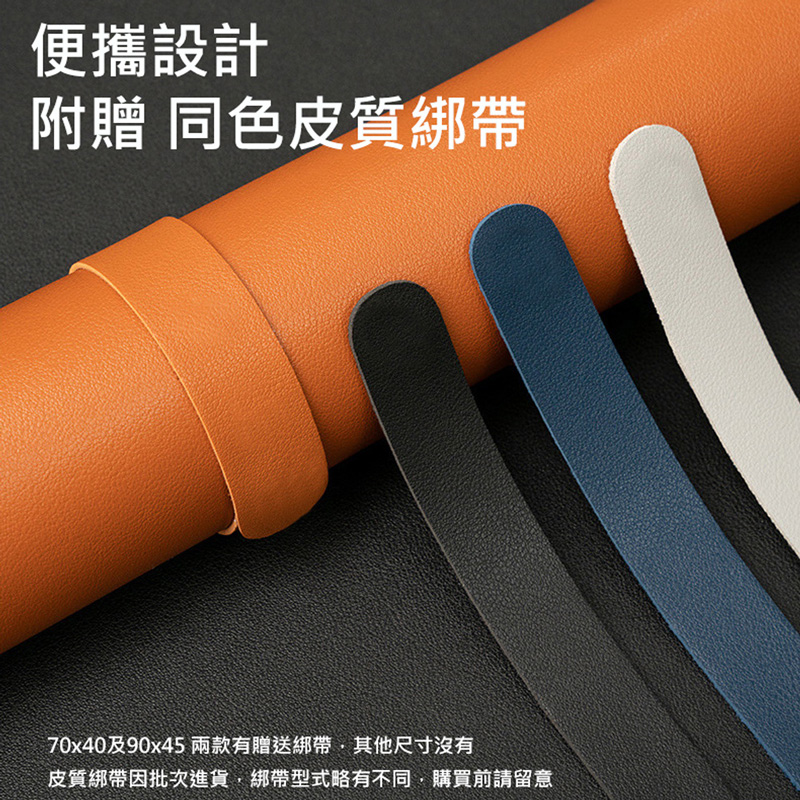 一體成形加大桌墊 無化學成分,贈同質同色綁帶 可方便攜帶。(※小款滑鼠墊不附綁帶)