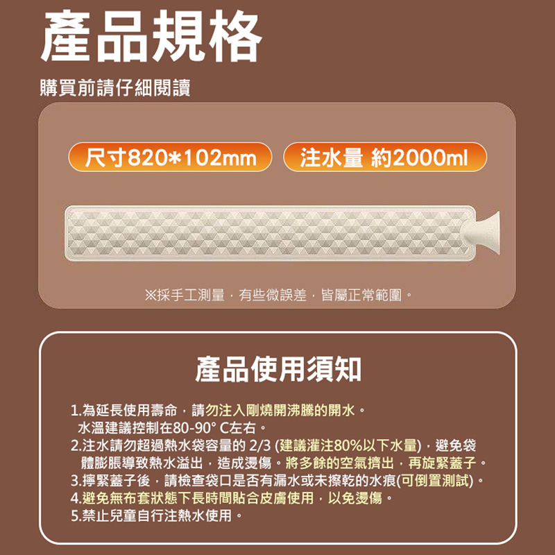 ※熱水袋為橡膠材質,首次使用會有塑膠味道,可將商品放置陰涼通風處散味即可。商品有氣味皆不屬於瑕疵範圍。