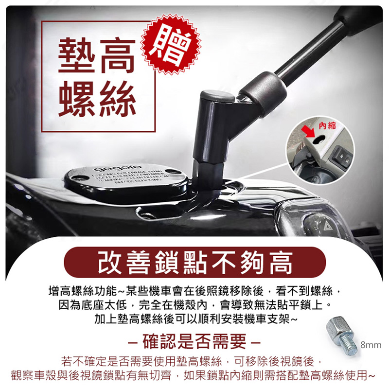 2.適用後視鏡根部直徑8mm 的鏡座。直接鎖在「後照鏡」上。