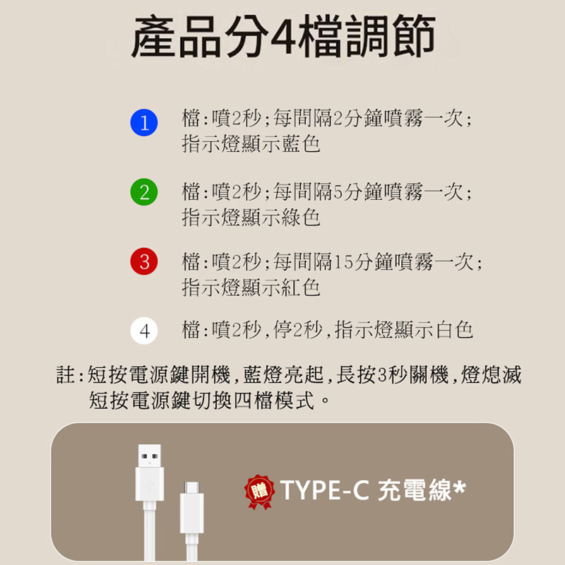 模式四:燈光顯示白色,每間隔2秒鐘噴霧2秒。