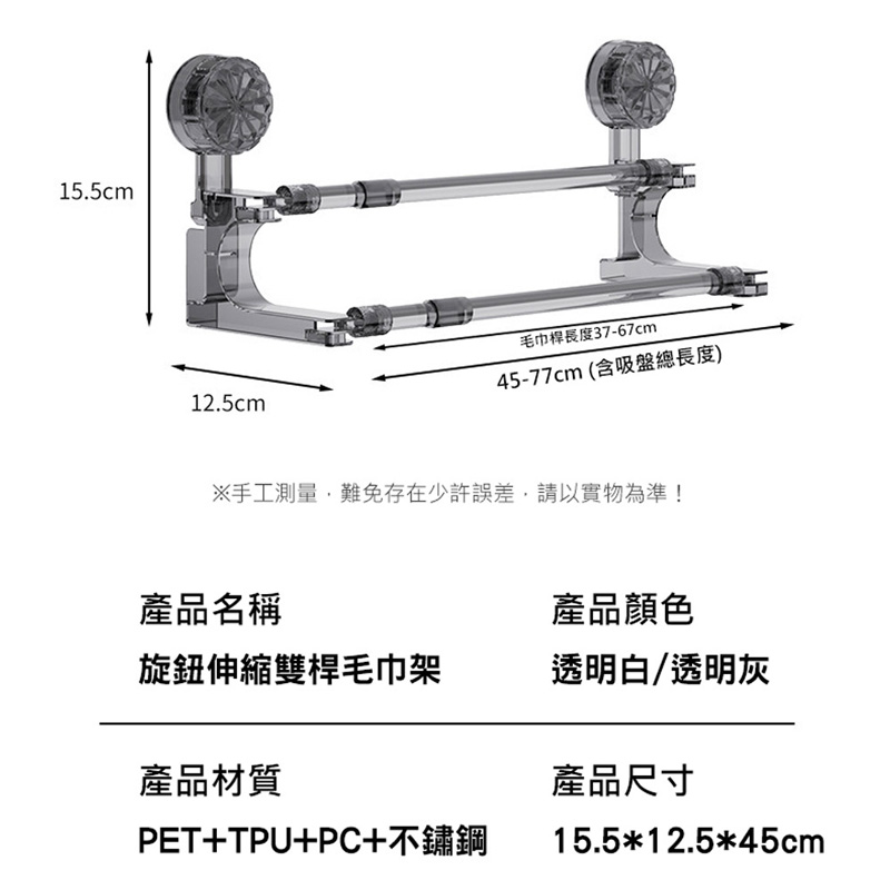 產品尺寸:15.5*12.5*伸縮45~77cm / 毛巾桿長度37~67cm