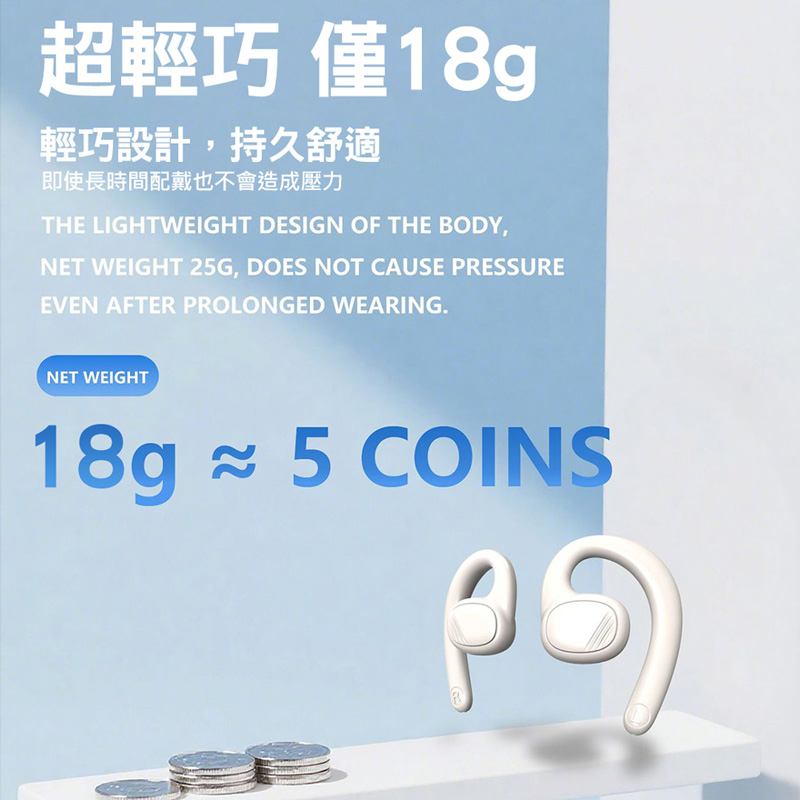 機身輕巧,淨重18g,即使長時間配戴也不會造成壓力。