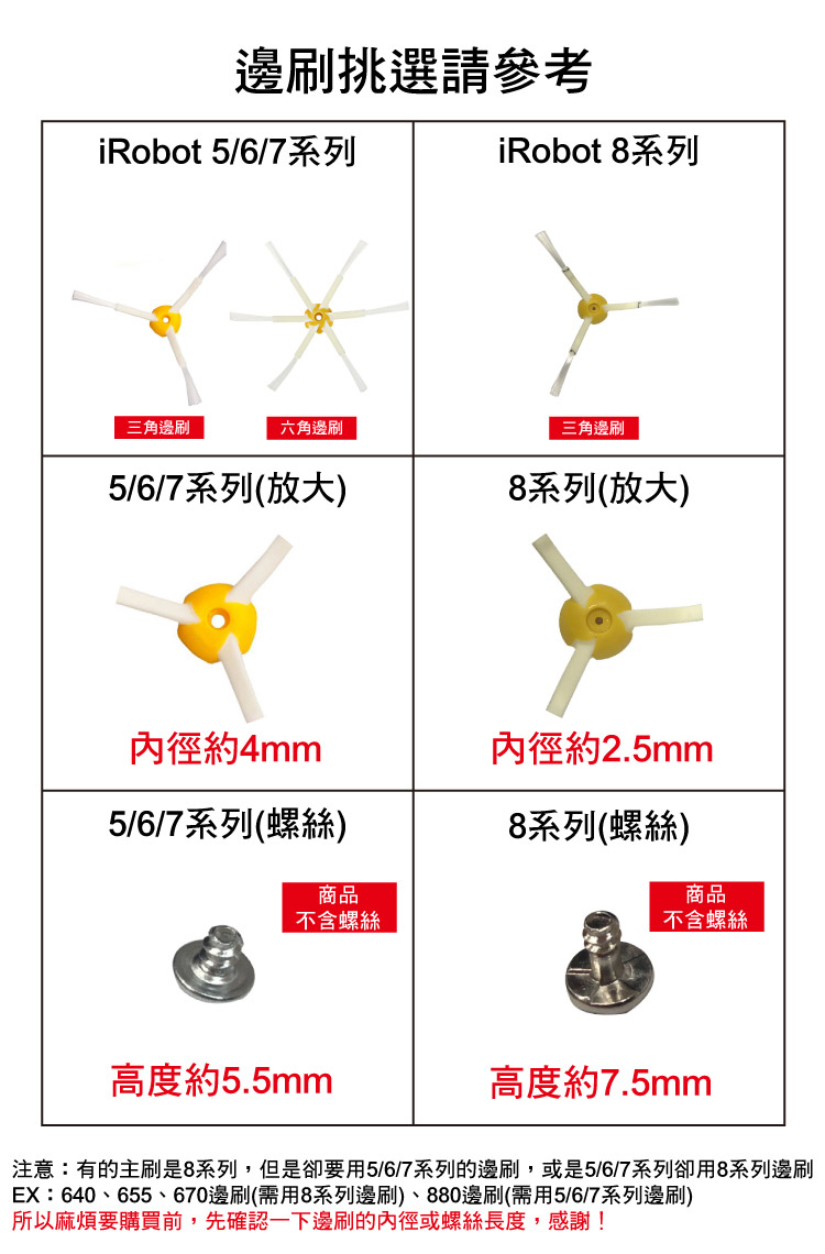 ●適用於iRobot Roomba 500 600 700系列,530 531(01) 531(02) 533 534 536 541 545 585 595 606 614 620 630 637 650 660 670 671 680 690 695 皆可共用(型號645和655除外),因型號眾多,請自行查詢或核對圖片是否適用。