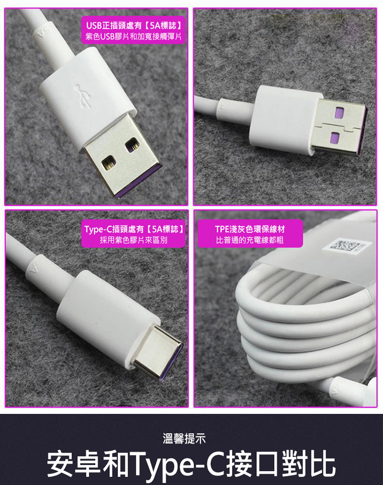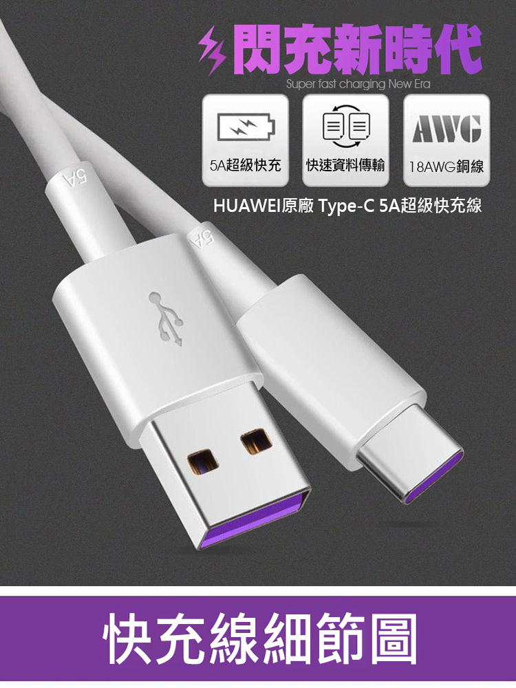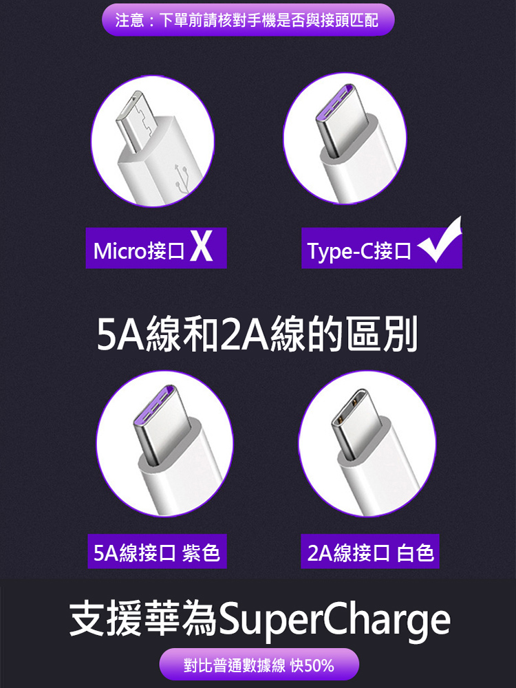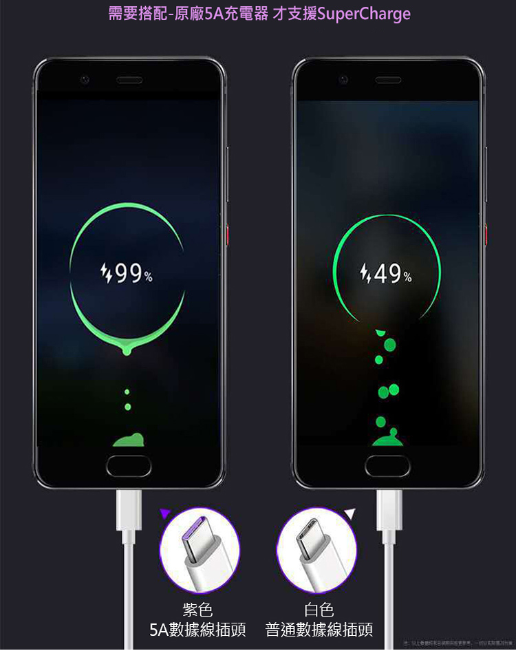 此5A快充線,需搭配華為原裝Super charge充電頭才能過4.5-5A電流,請注意!其他機型不能達到5A電流,僅當一般充電功能,購買前請確認清楚。