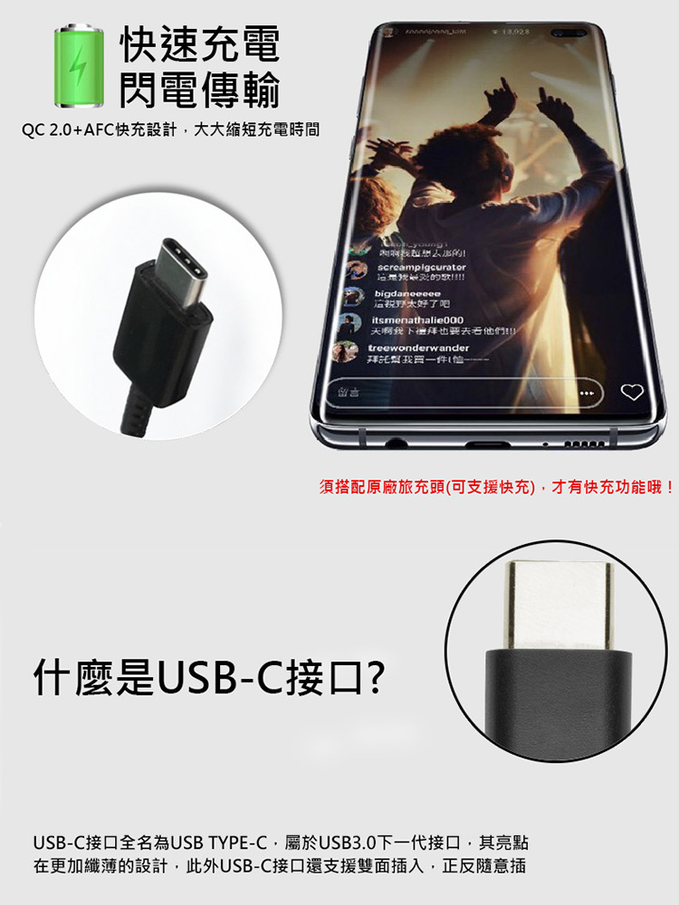 ●須搭配原廠旅充頭(可支援快充),才有快充功能哦!