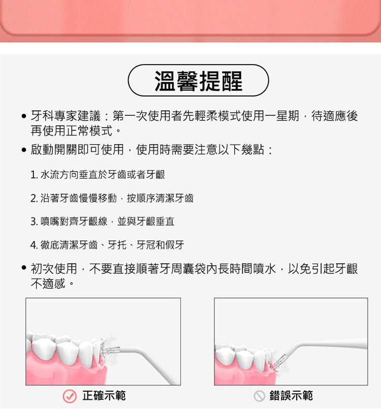 .初次使用,不要直接順著牙周囊袋內長時間噴水,以免引起牙齦不適感。