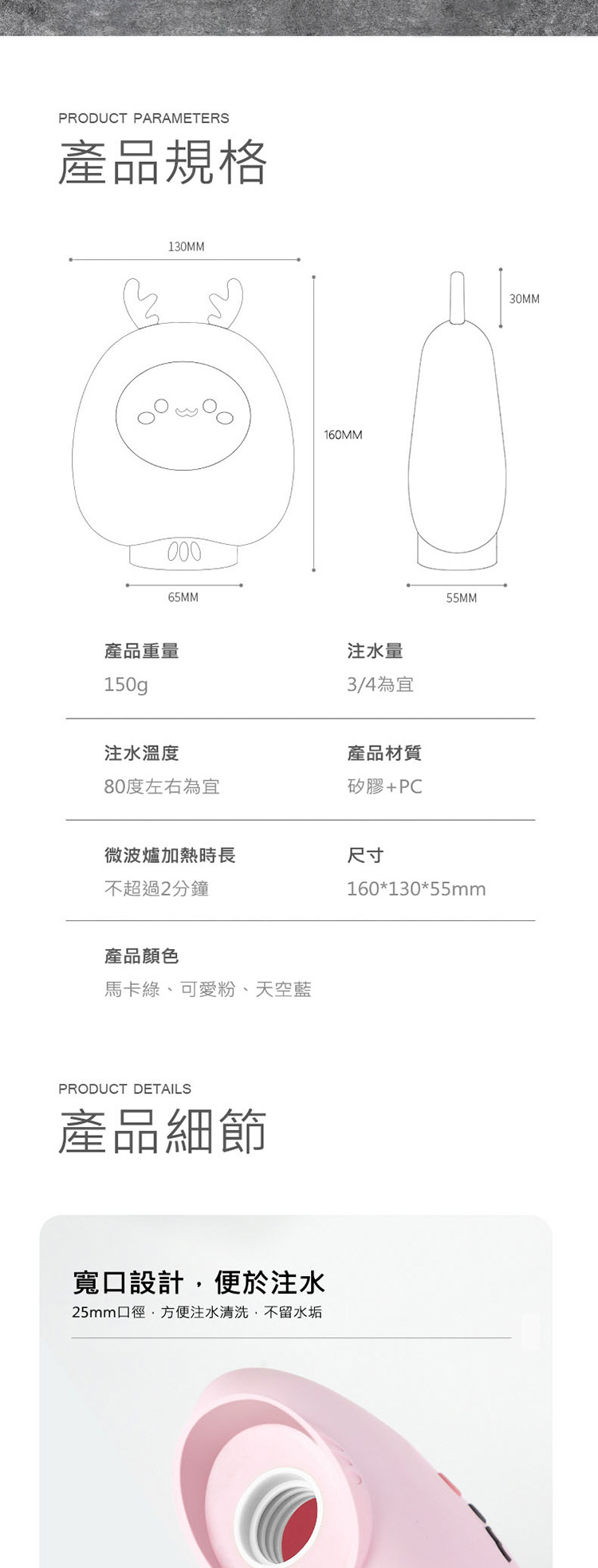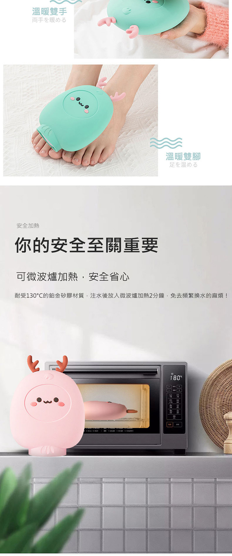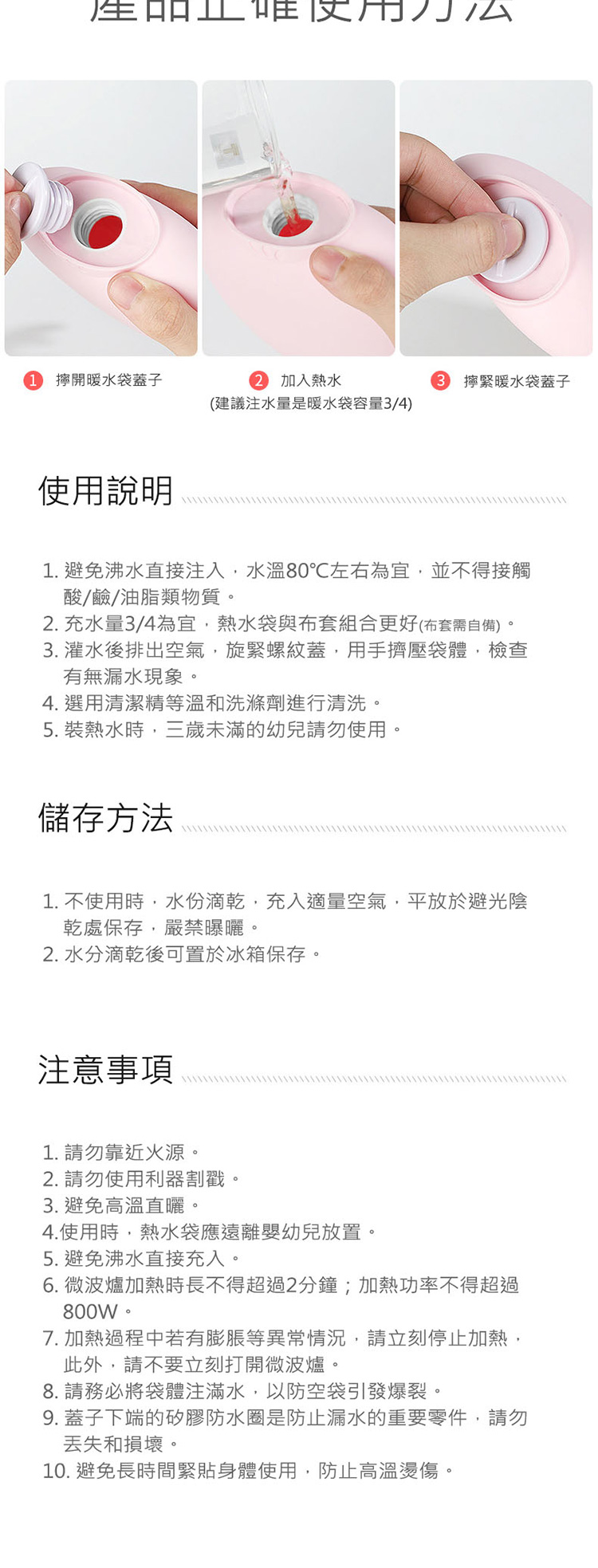 灌滿水後放入微波爐加熱,輕鬆便捷,省去燒水麻煩,適用於身體疲勞及生理期女性使用。