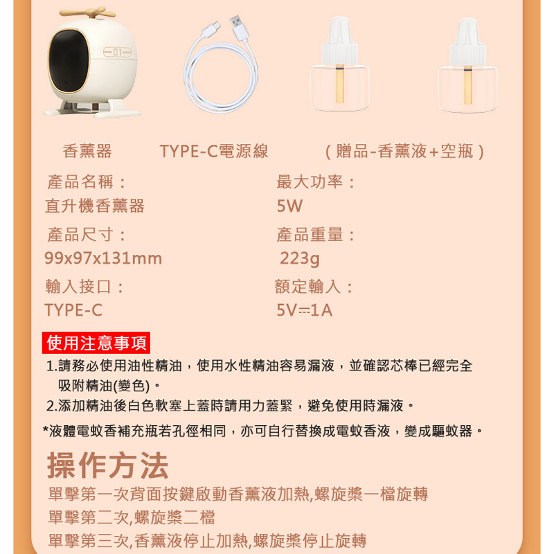 直升機香薰機 加熱式迷你擴香機/香氛機 無火精油 兩段風速 擴香/香氛/驅蚊 (USB供電)