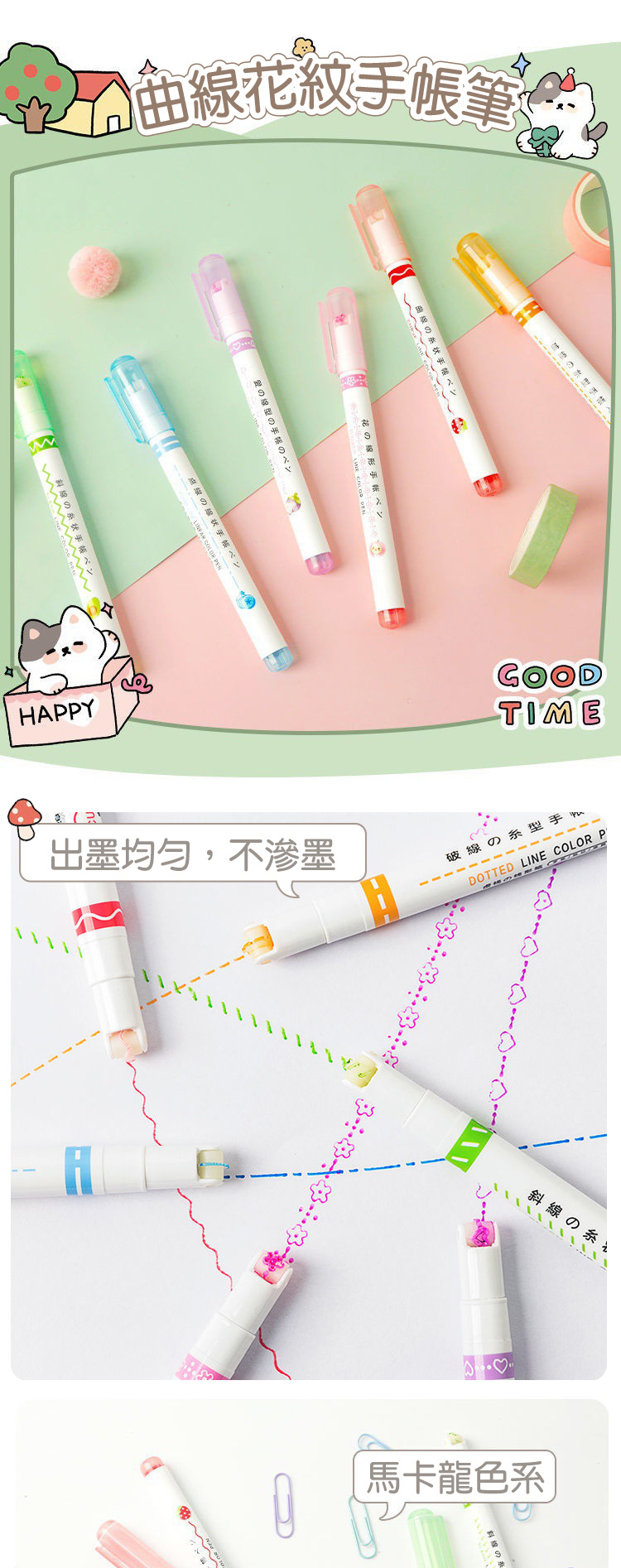 曲線花紋手帳筆 輪廓記號筆 筆記螢光筆 波浪線形筆 花型筆 手抄標記曲線筆 彩色筆 重點標記筆 塗鴉 記號筆 學生手帳 文具 記號筆 花紋筆 花邊筆 6支裝