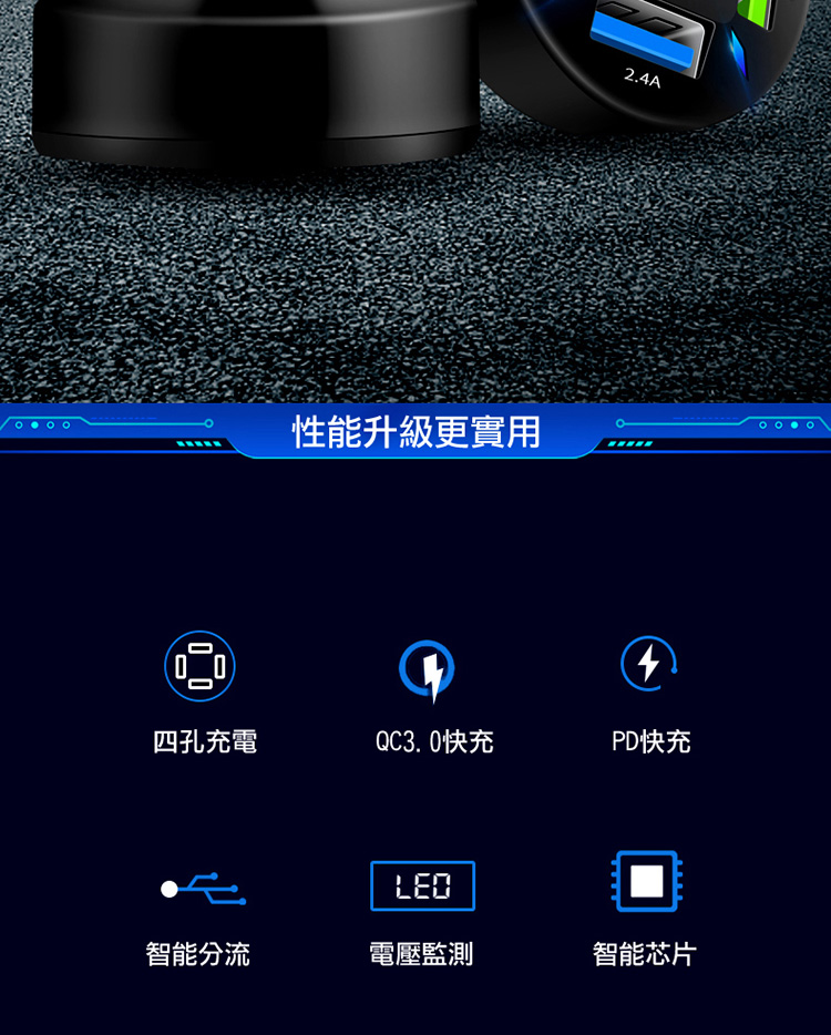 ●PD+QC3.0+2USB,4孔可運用,充電更便利